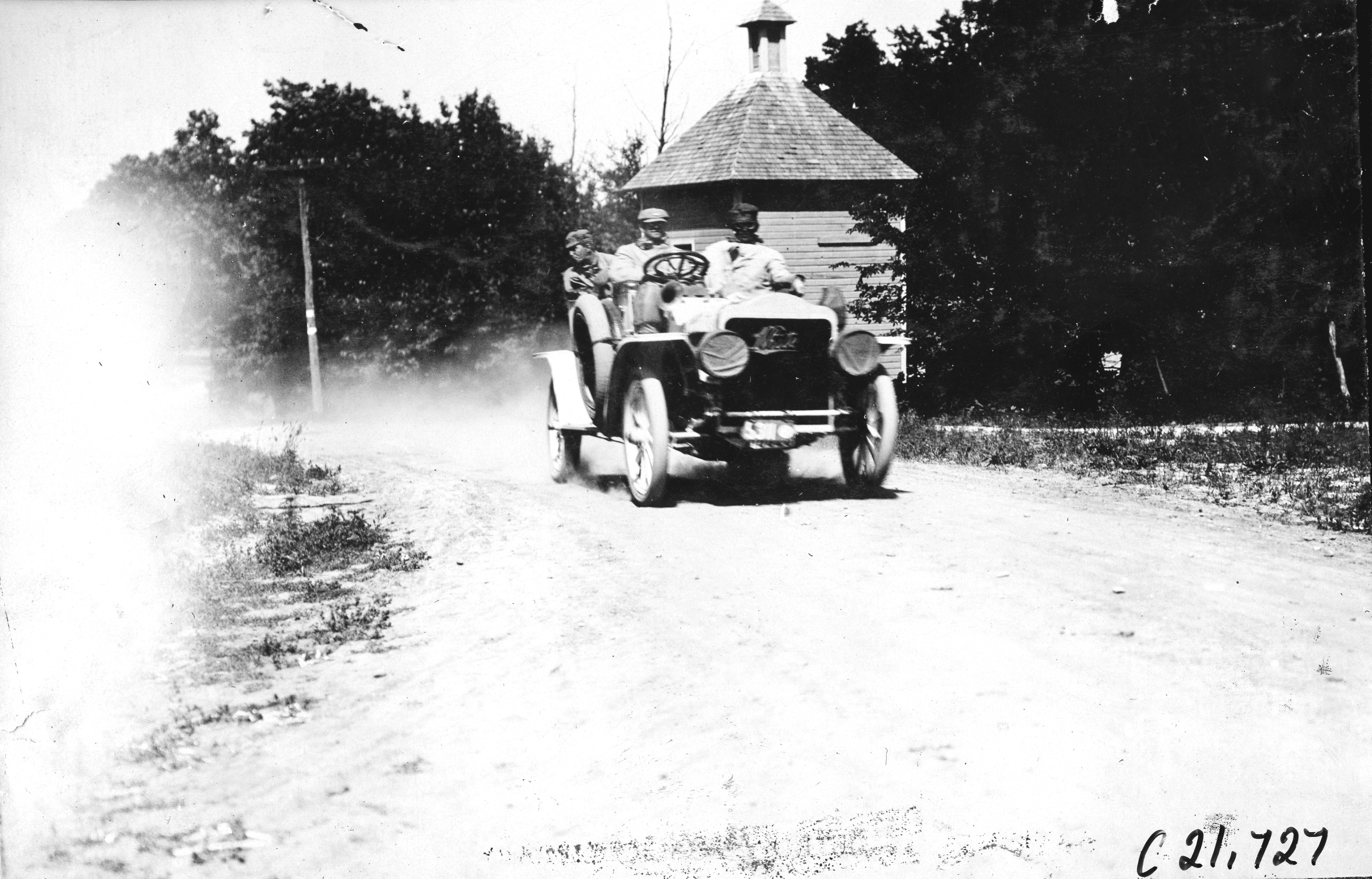 4.25x6.5 black and white photograph of J.N. Searles and two passengers in White Steamer car on rural road at Madison Lake, Minnesota, at the 1909 Glidden Tour. Negative #C21,727. Photo edges cut unevenly.