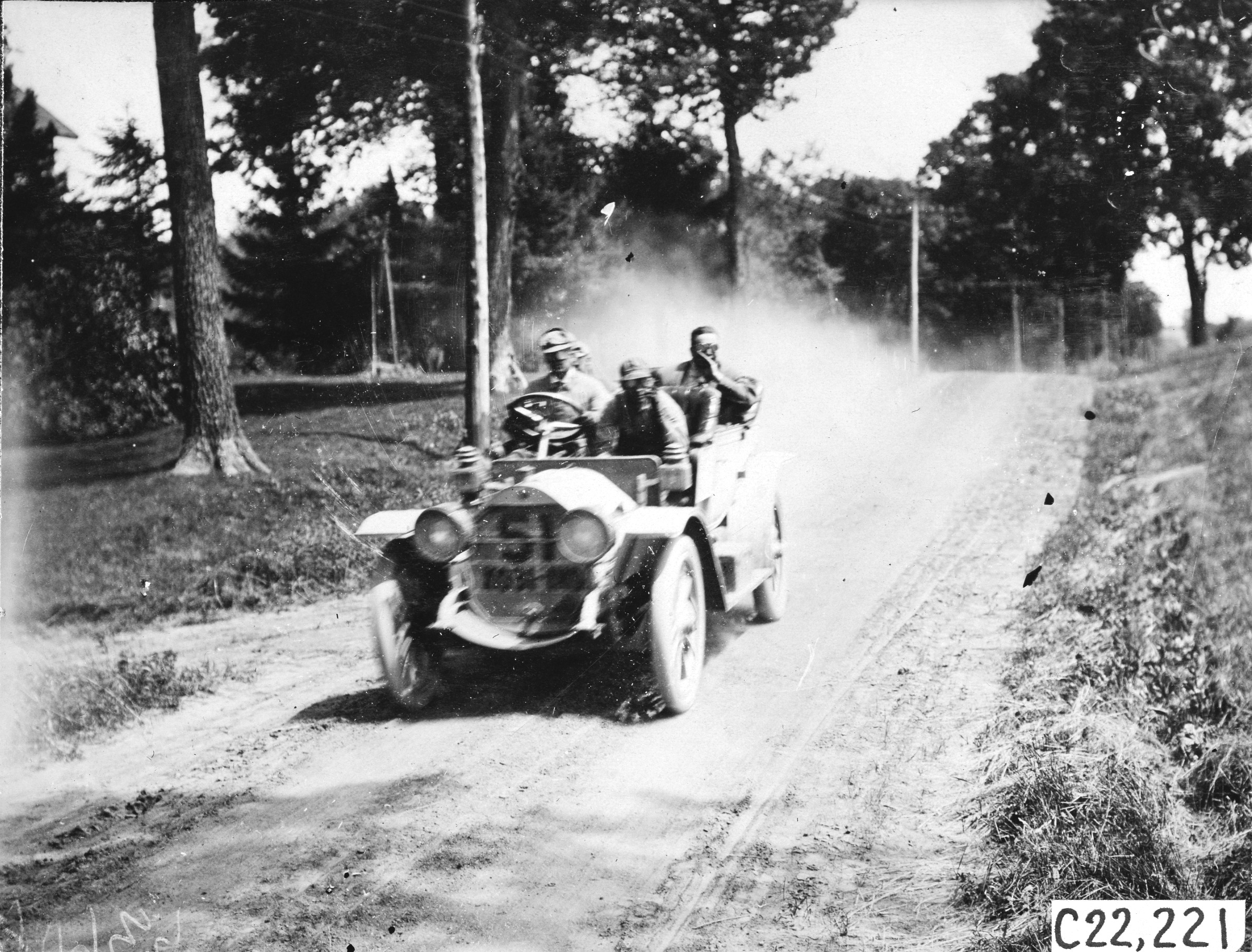 4.5x6 black and white photograph of W.A. Woods and three passengers in Simplex #51 on rural road near Madison Lake, Minnesota, at the 1909 Glidden Tour. Negative #C22,221.
