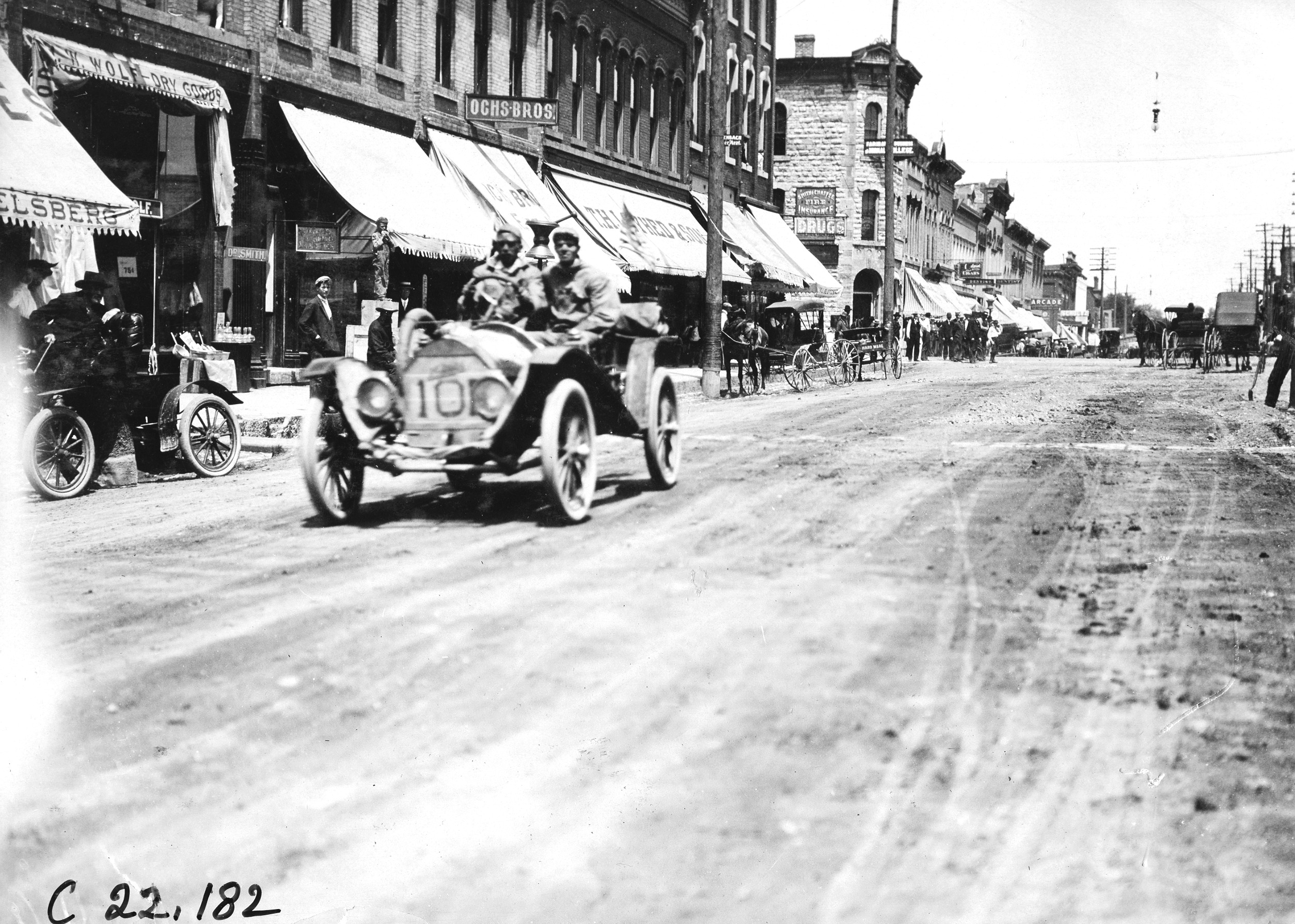 4.5x6.25 black and white photograph of unidentified driver and passenger in Moline car, passing through business district in Madison Lake, Minnesota, at the 1909 Glidden Tour. Negative #C22,182.