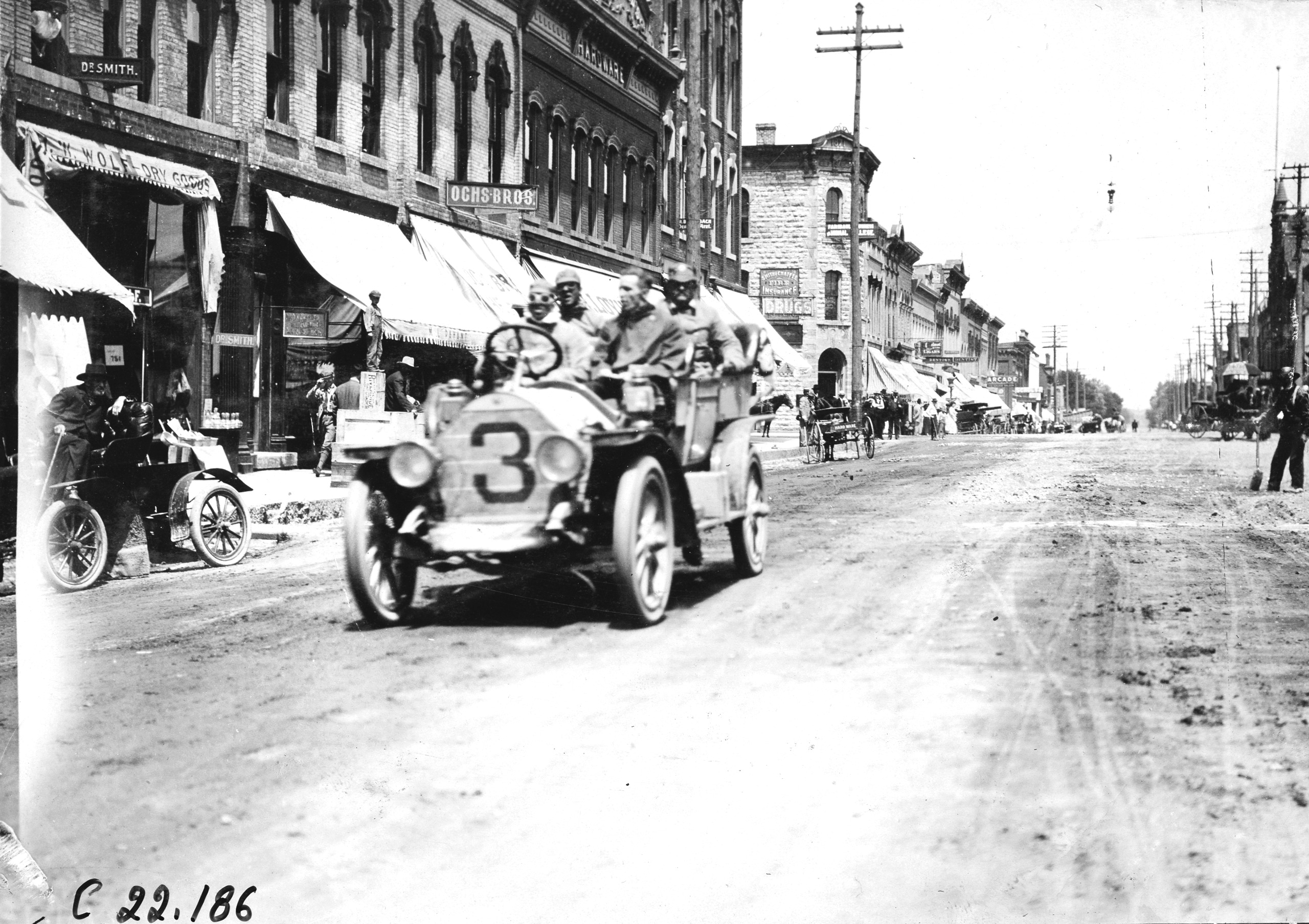 4.5x6.5 black and white photograph of William Bolger and three passengers in Chalmers #3, passing through business district in Madison Lake, Minnesota, at the 1909 Glidden Tour. Negative #C22,186. Photo edges cut unevenly.