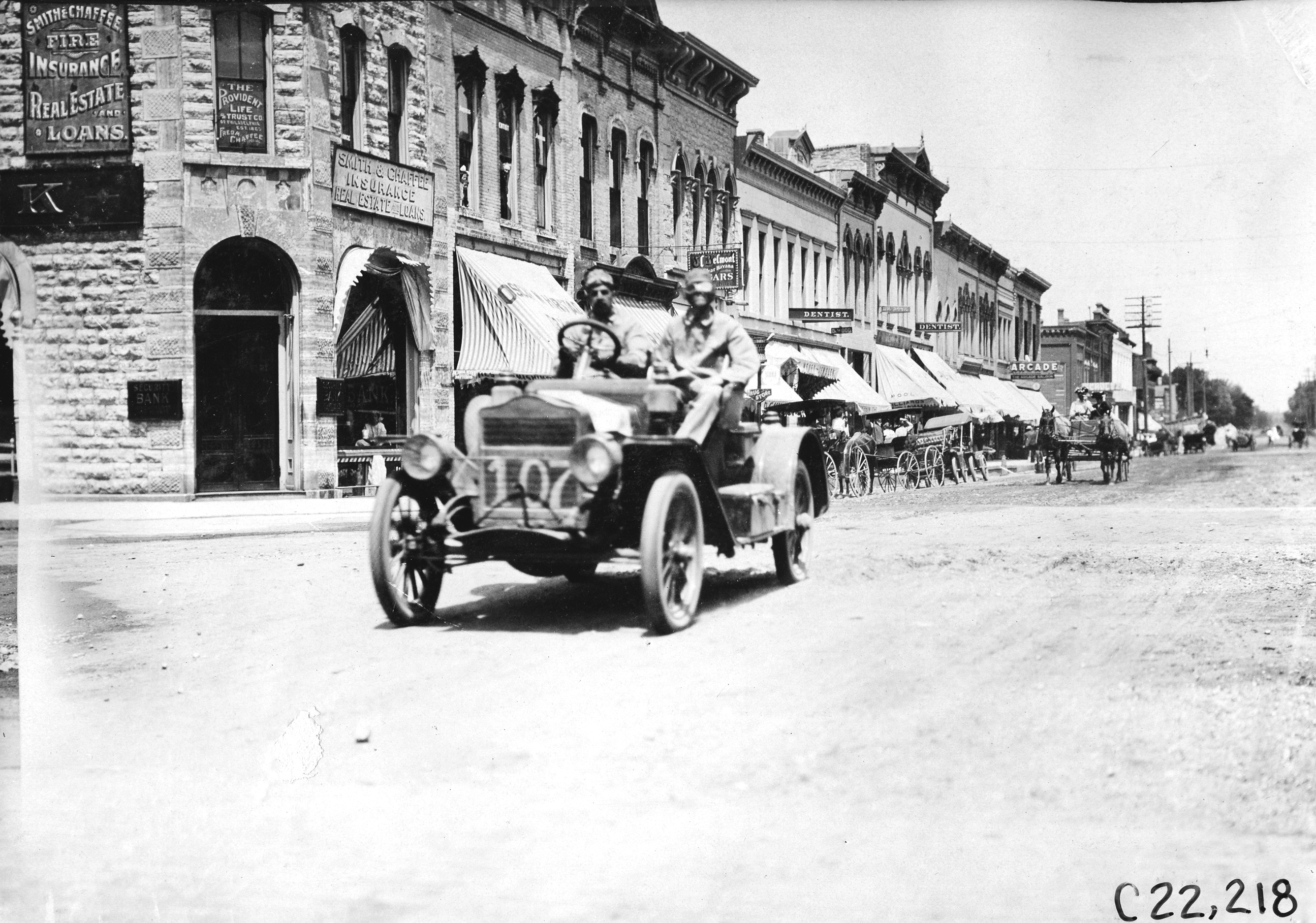 Charles Goldthwaite in Maxwell car passing through Madison Lake, Minn., at 1909 Glidden Tour