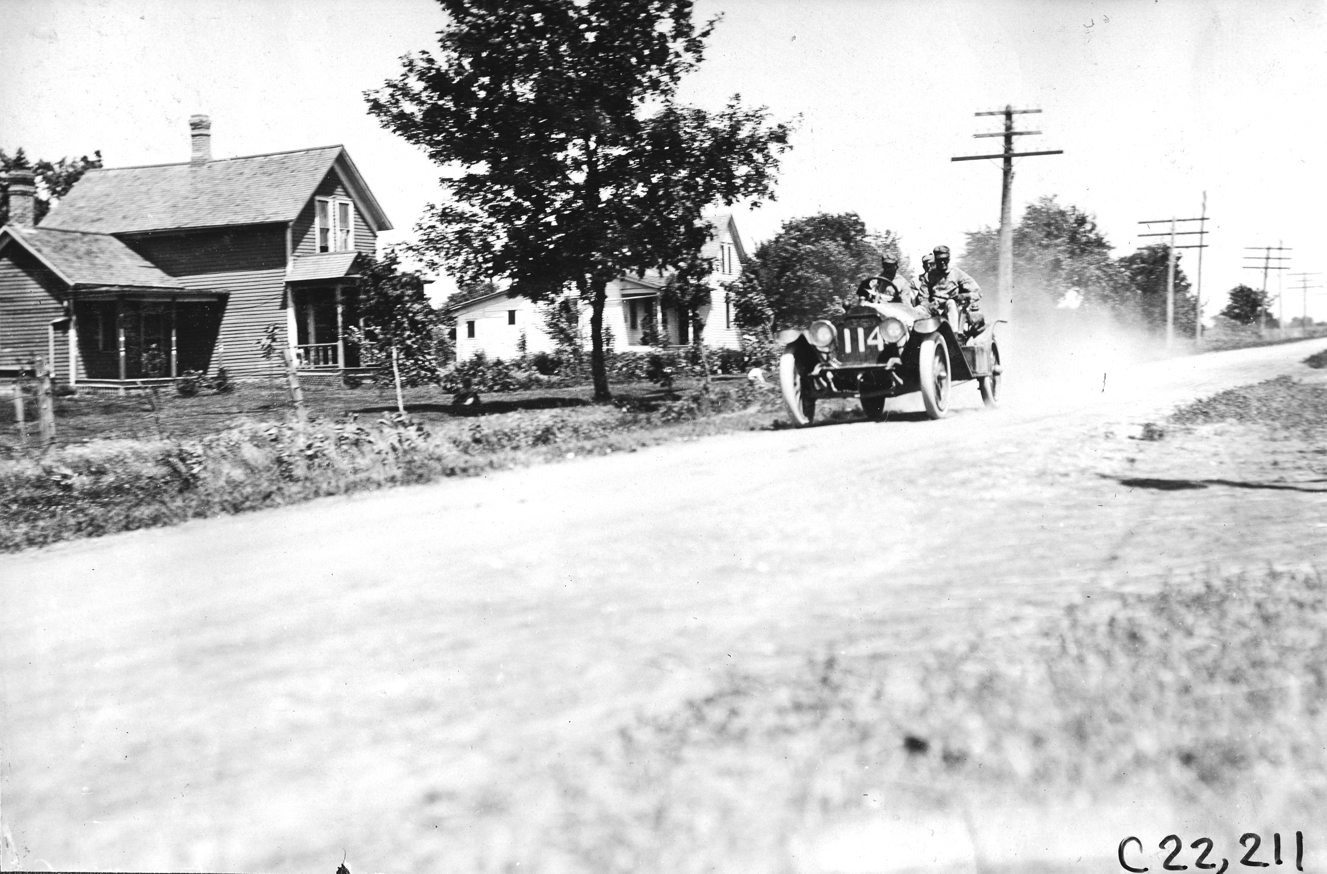 4.5x6.5 black and white photograph of John C. Moore and two passengers in Lexington car #114 entering Mankato, Minnesota, houses on side of road, at the 1909 Glidden Tour. Negative #C22,211. Photo edges cut unevenly.