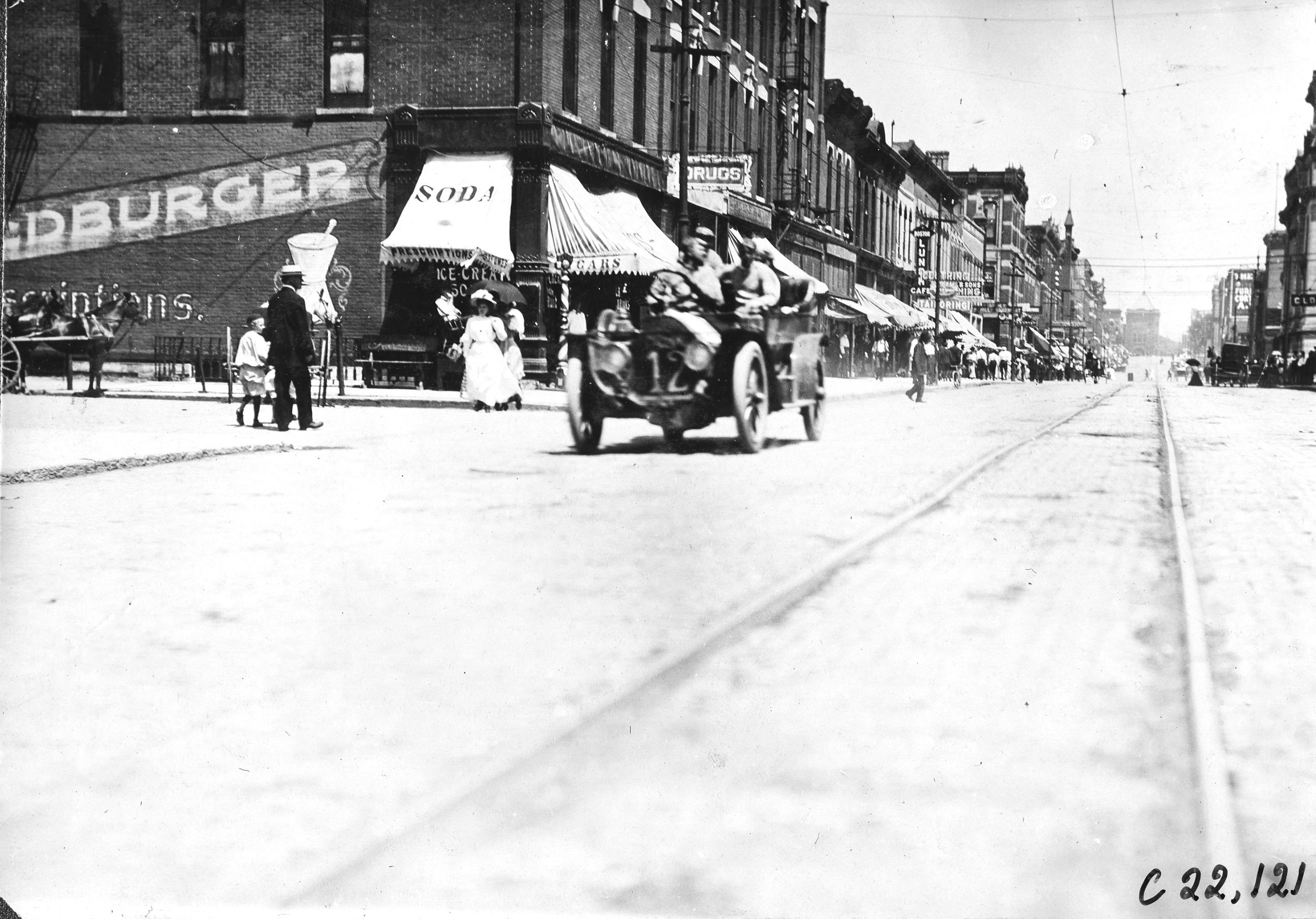 4.75x6.5 black and white photograph of car #12, with driver and two passengers, on commercial street, probably Mankato, Minnesota, trolley tracks down center, at 1909 Glidden Tour. Negative #C22,121.