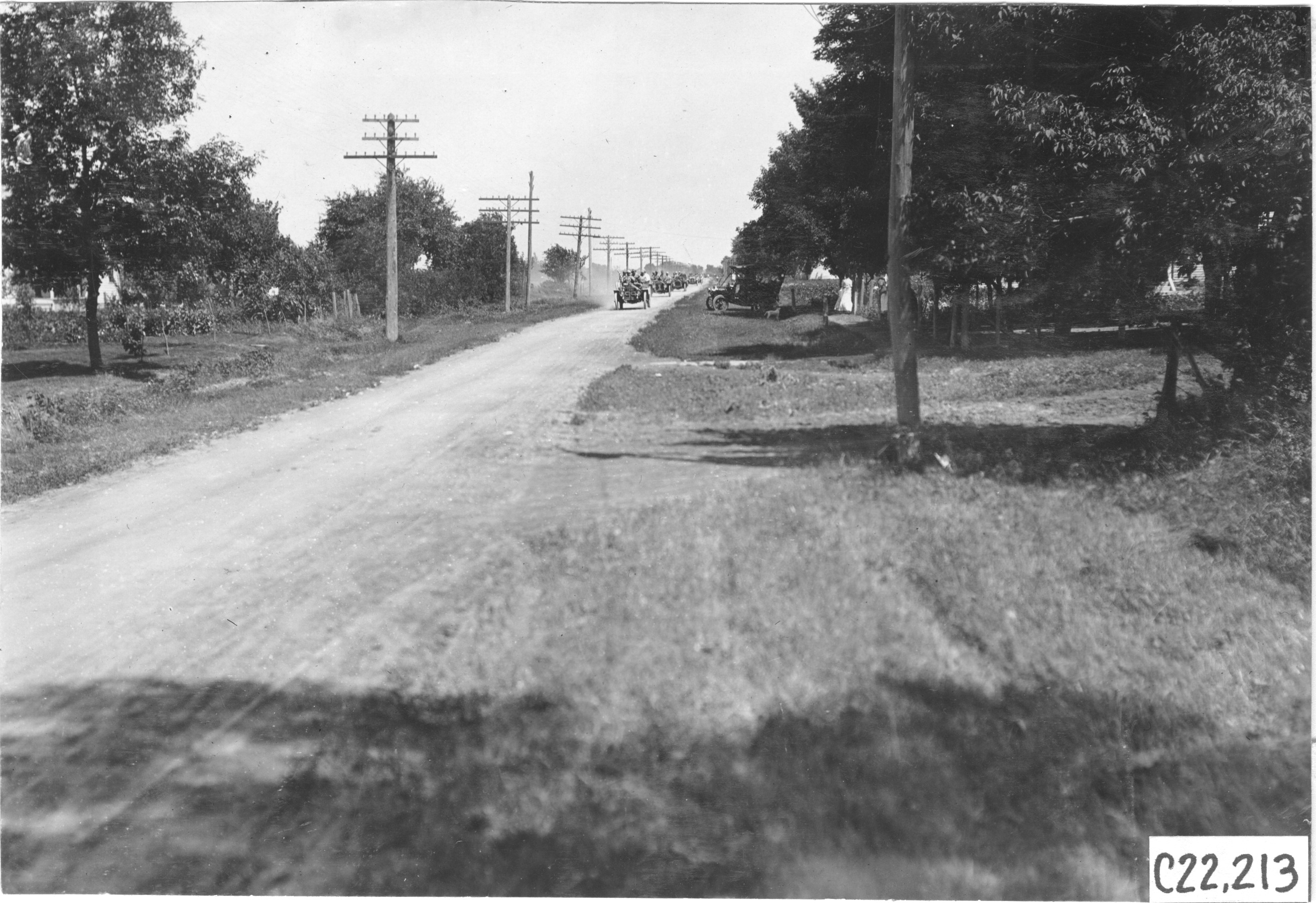 4.5x6.5 black and white photograph of Chairman Hower entering Mankato, Minnesota, from a distance on a rural street, cars following behind and a car parked off to the side of the road, at the 1909 Glidden Tour. Negative #C22,213.
