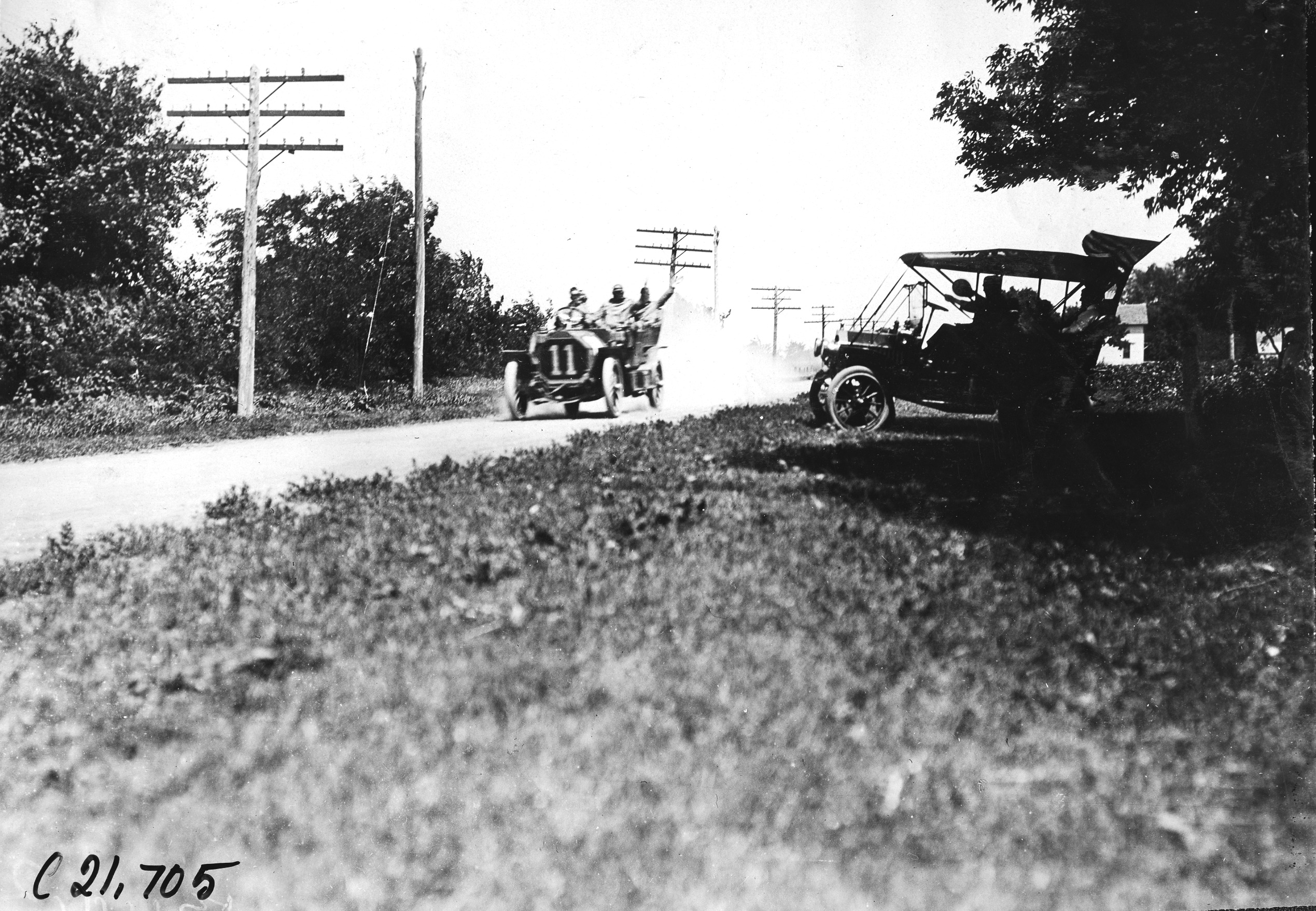 4.75 x 6.5 black and white photograph of car #11, with driver and two passengers, man in back seat waving to car parked off to the side of the road, in Mankato, Minnesota, at the Glidden Tour. Negative #C21,705. Photo edges cut unevenly.