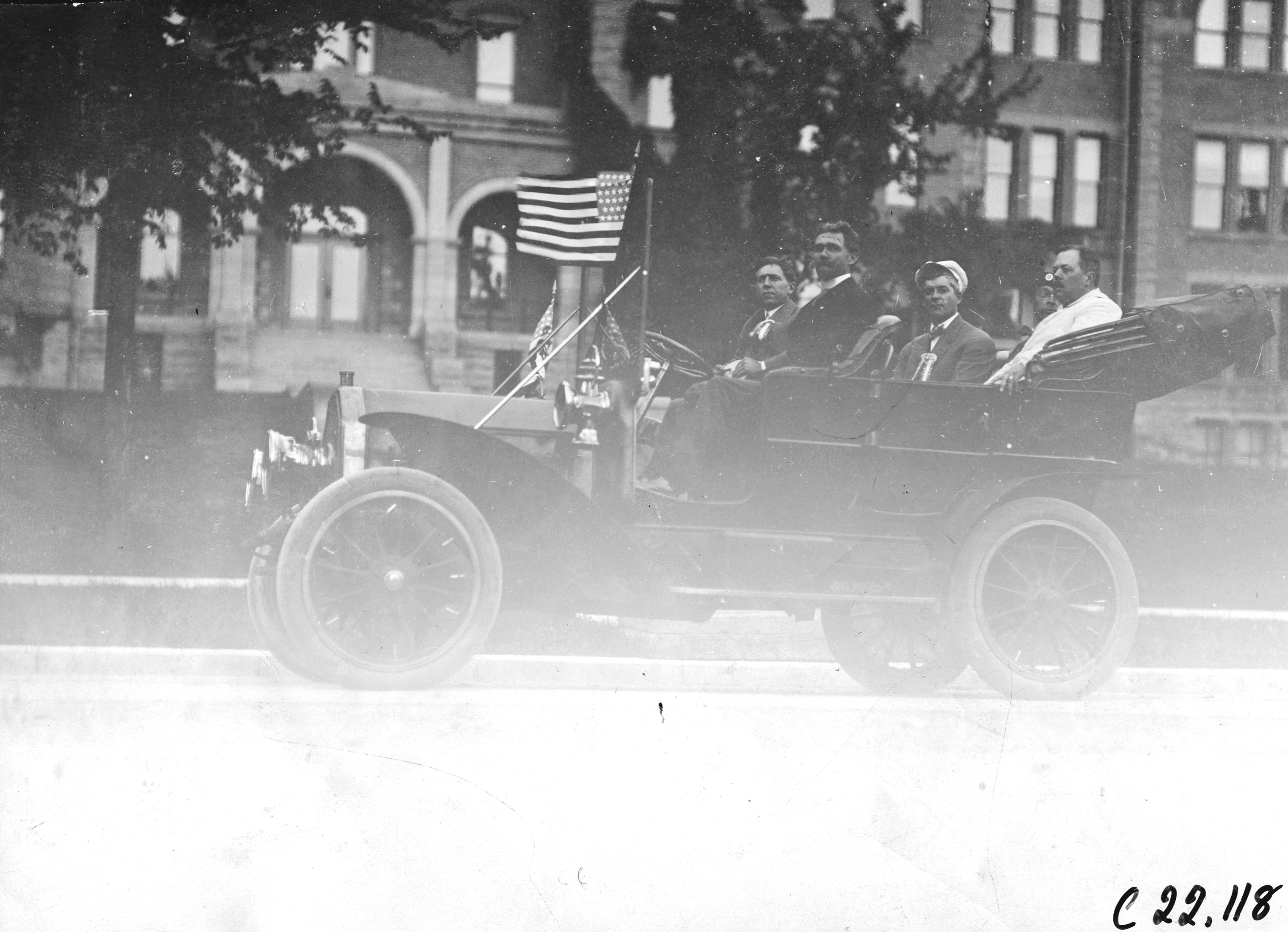 4.5x6.5 black and white photograph of Charles J. Glidden and party in a Buick parked in front of a large building, American flag waving on car, at Mankato, Minnesota, at the 1909 Glidden Tour. Negative #C22,118. Photo edges cut unevenly.