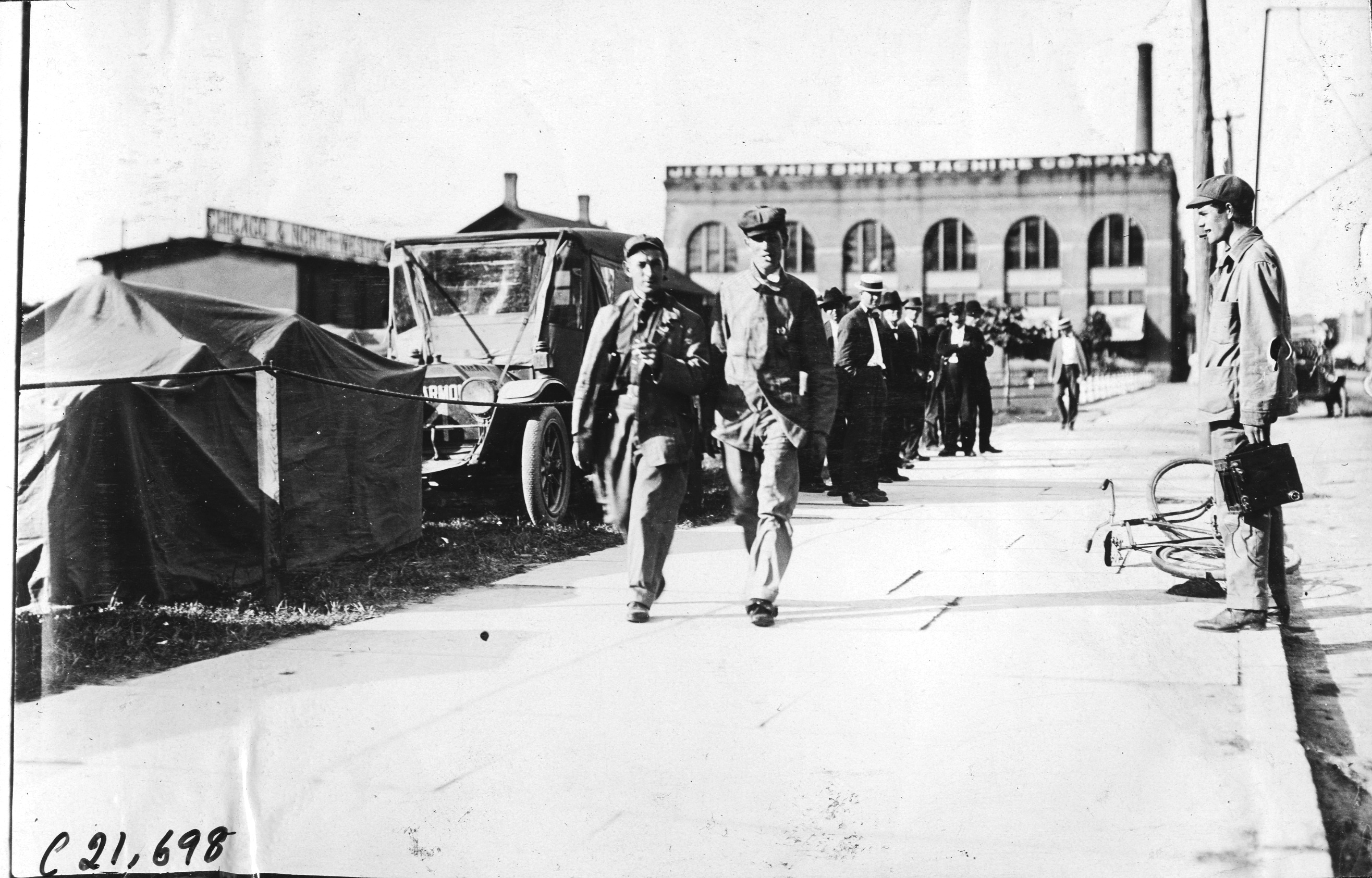 4.25x6.75 black and white photograph of covered cars parked at Minneapolis, Minnesota, two drivers walking toward camera, people standing on the sidewalks and streets looking on, a bicycle laying on its side, at the 1909 Glidden Tour. Negative #C21,698. Photo edges cut unevenly.