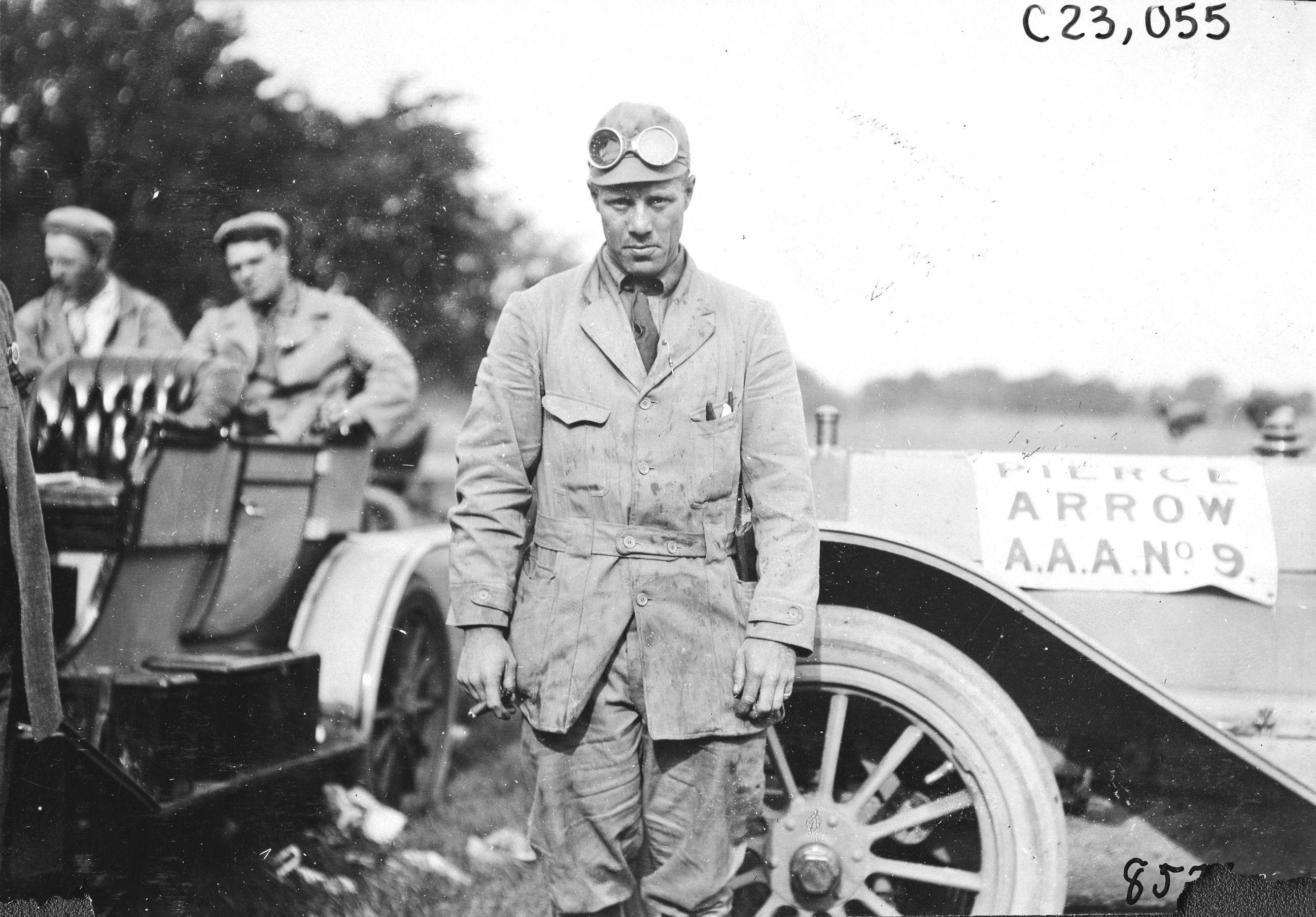 Glidden Tour driver next to Pierce-Arrow car at 1909 Glidden Tour