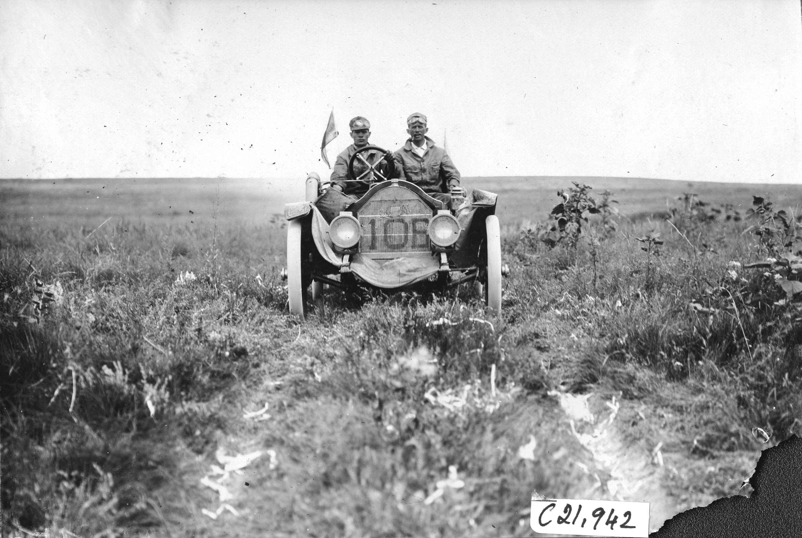 4.5x6.5 black and white photograph of Frank Steinman and passenger in the Hupmobile car #106 driving on the Iowa prairie, at the 1909 Glidden Tour. Negative #C21,942. Lower right side of picture is missing.