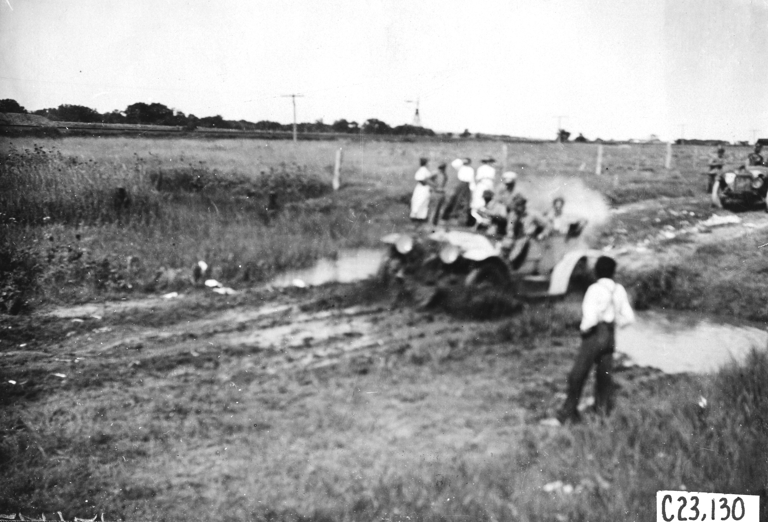 4.5x6.5 black and white photograph of a car that appears to be stuck in mud, women and men looking on, at the 1909 Glidden Tour. Negative #C23,130.