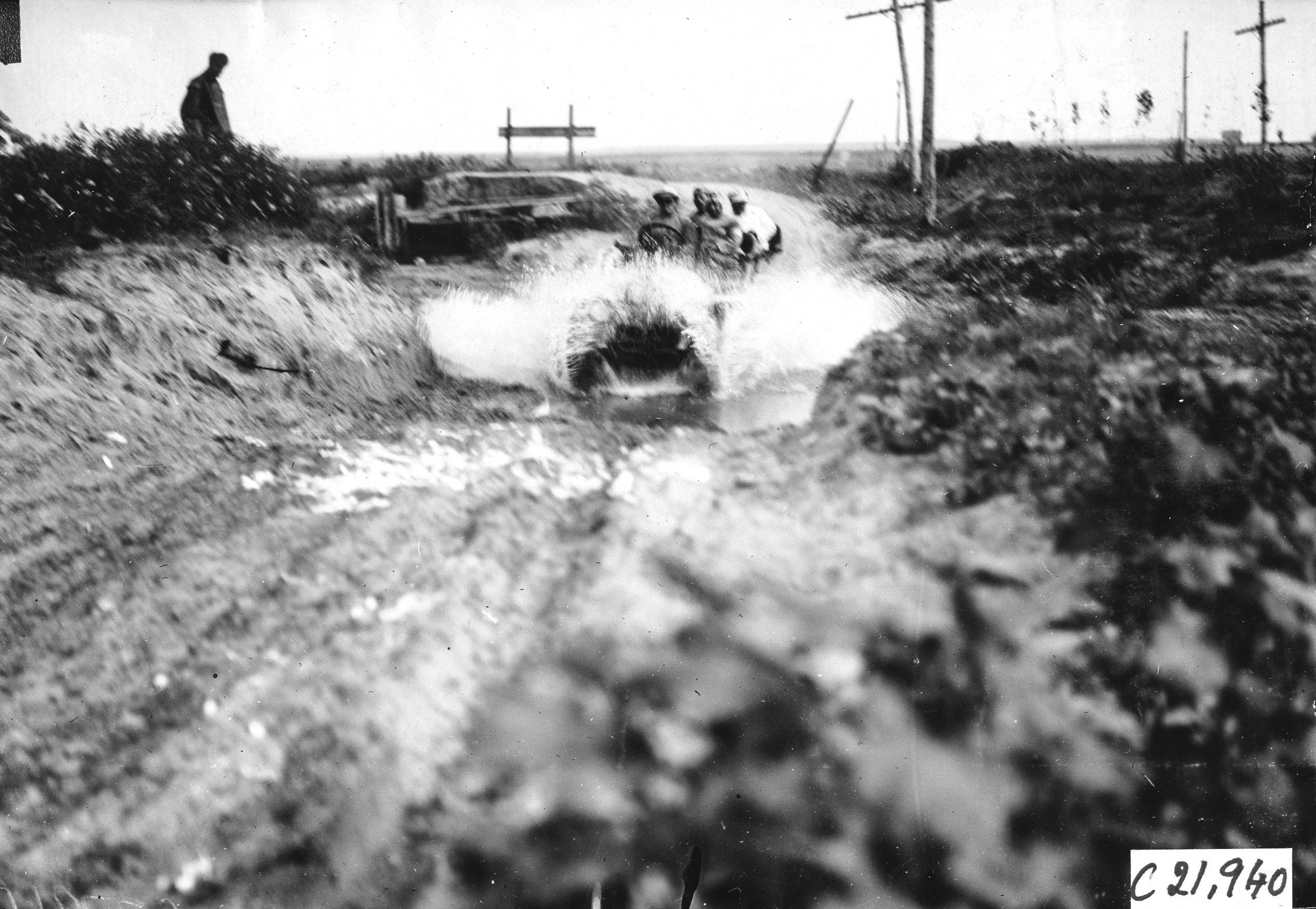 4.5x6.5 black and white photograph of Chairman Hower in the Premier car #99 passing through the creek, front of car obliterated by splashing water, man standing above creek looking on, at the 1909 Glidden Tour. Negative #C21,940. Photo edges cut unevenly.