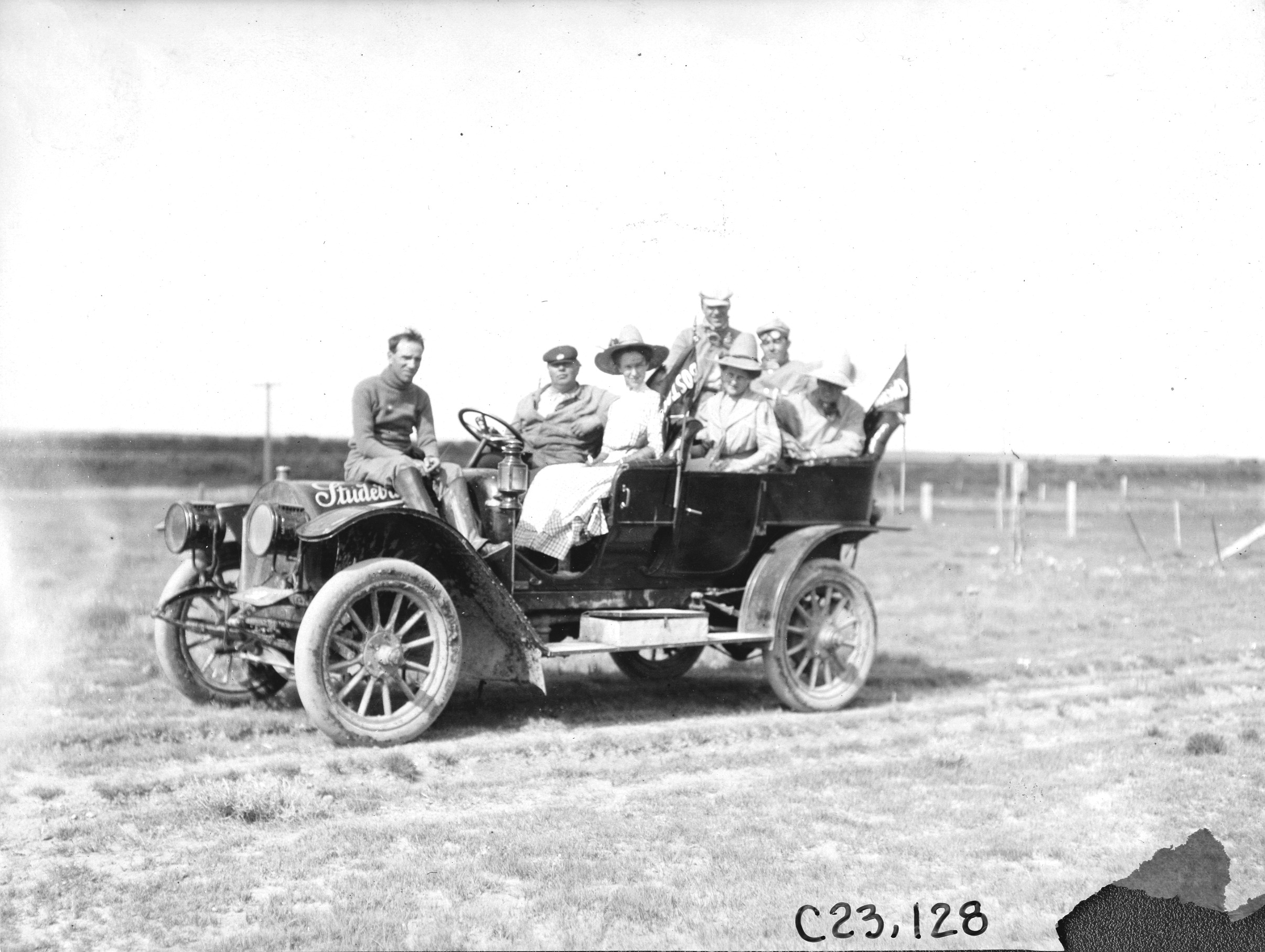 4.5x 6.25 black and white photograph of Studebaker press car driver and six passengers, including two women wearing straw hats, and a man sitting on the hood of the car, posing for a picture, at the 1909 Glidden Tour. Negative #C23,128. Lower right corner of picture is missing.