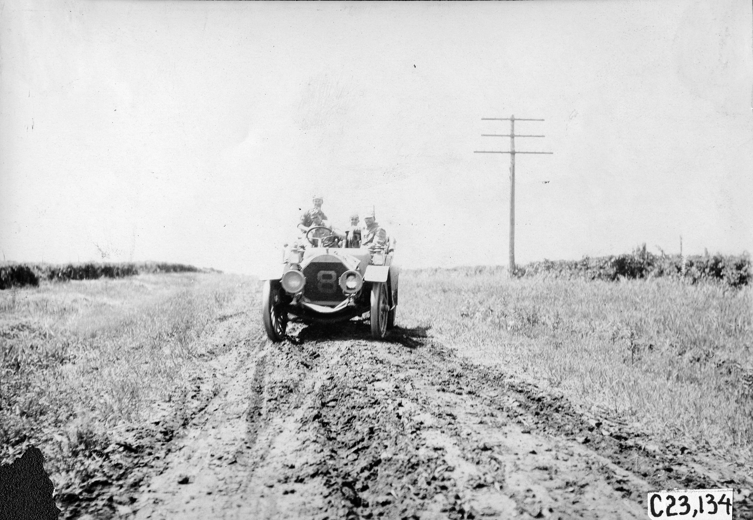 4.5x6.5 black and white photograph of driver and three participants in car #8, on the Iowa prairie, at the 1909 Glidden Tour. Negative #C23,134.