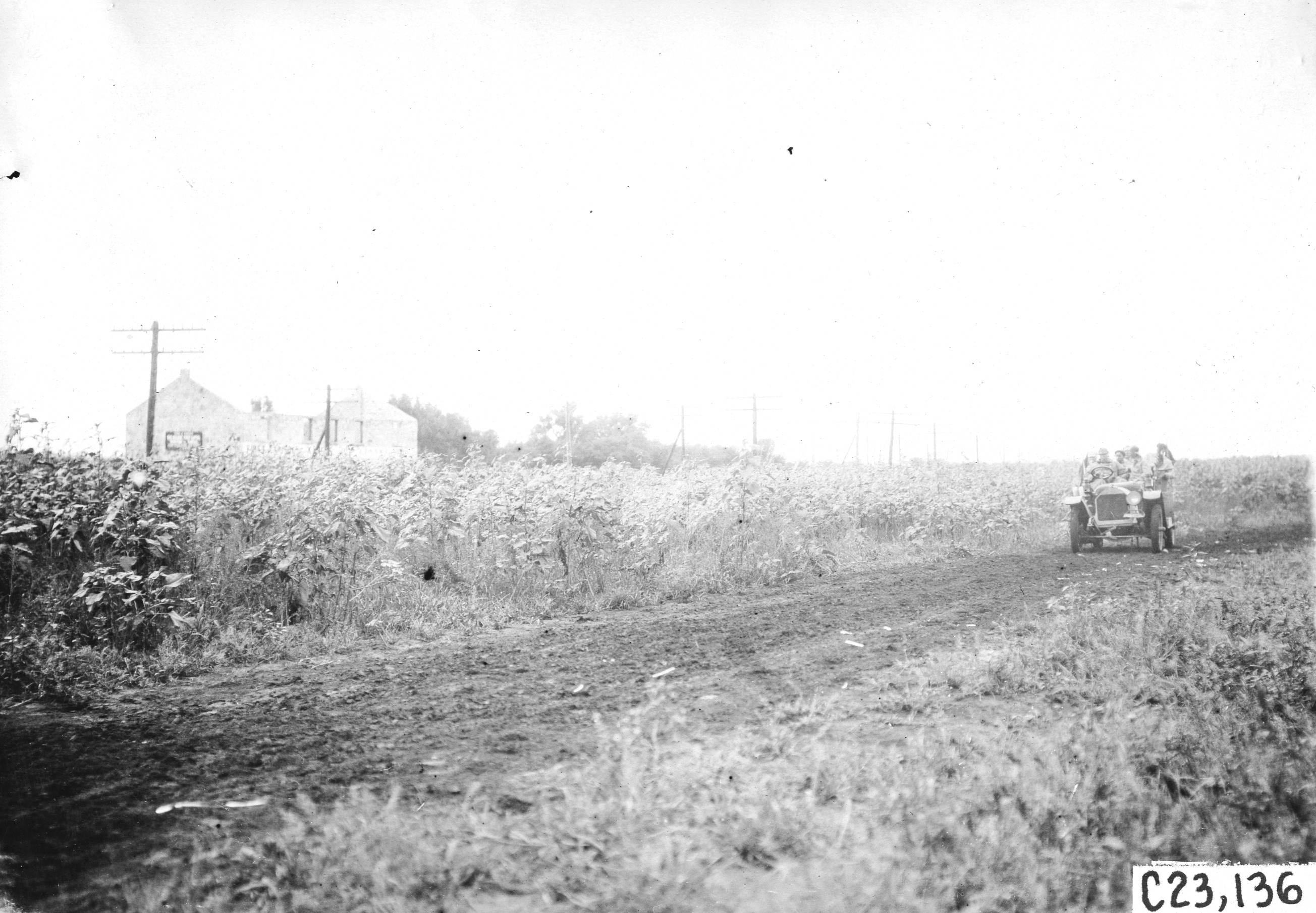 4.5x6.5 black and white photograph of participants on a dirt road next to a crop, a house in the background, crossing the Iowa prairie at the 1909 Glidden Tour. Negative #C23,136.