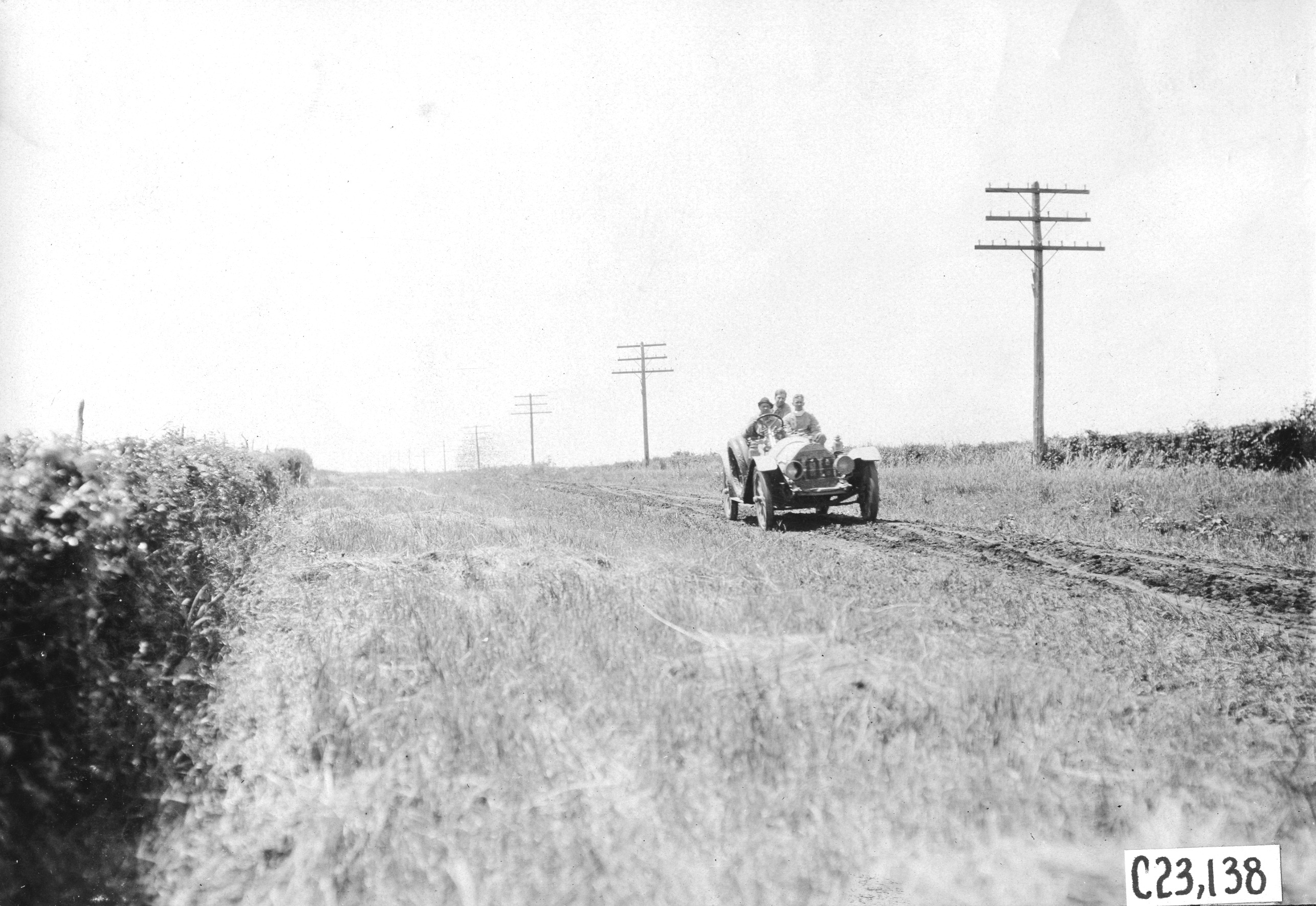 4.5x6.5 black and white photograph of participants on a dirt path in Iowa, at the 1909 Glidden Tour. Negative #C23,138.
