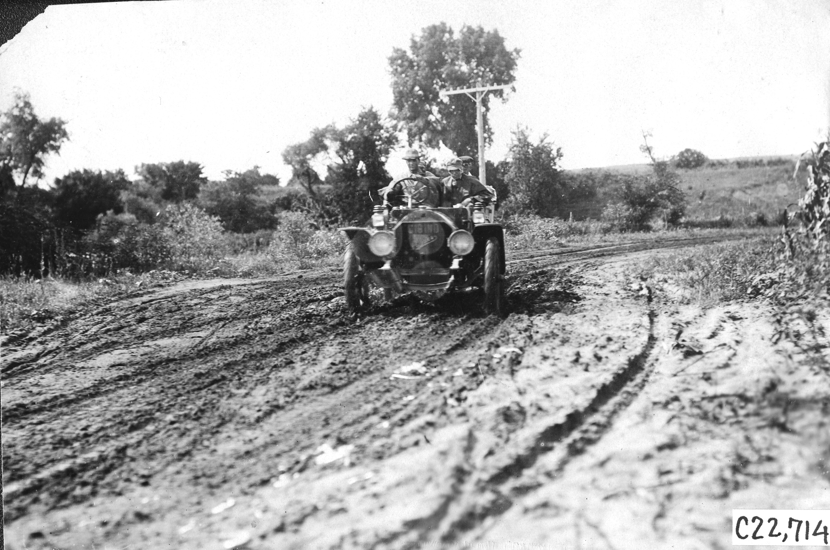 4.5x6.5 black and white photograph of participant car, driver and three passengers on a rutted dirt road in Iowa, at the 1909 Glidden Tour. Negative #C22,714. Photo edges cut unevenly.