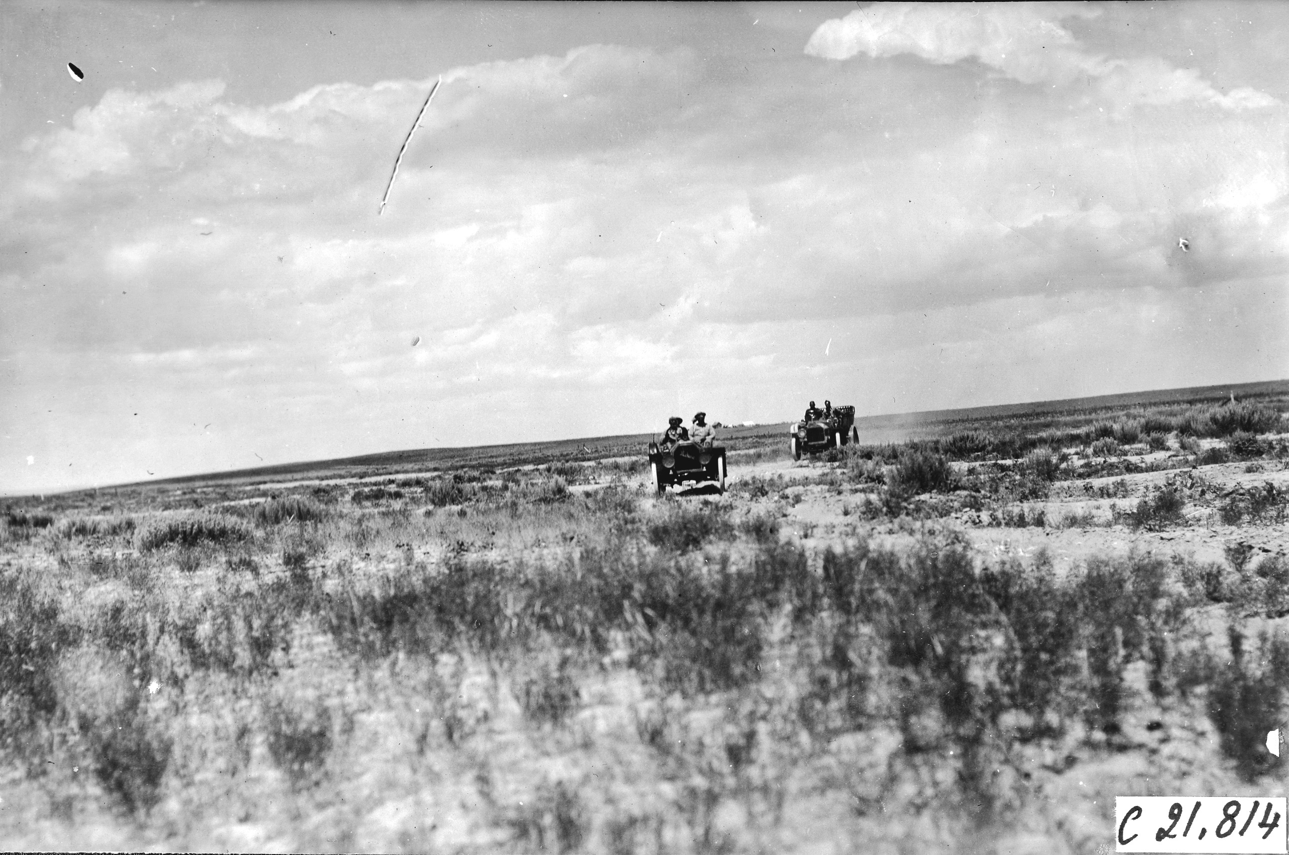 Moline car driven by J.M. Wicks and a vehicle close behind on the Iowa prairie, at the 1909 Glidden Tour