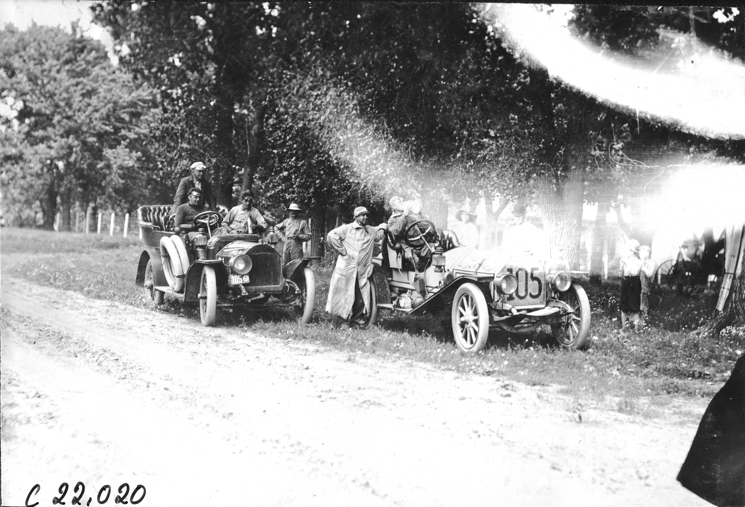 J. Machesky in Chalmers car and Studebaker press car stopped near Woodbine, Iowa at 1909 Glidden Tour