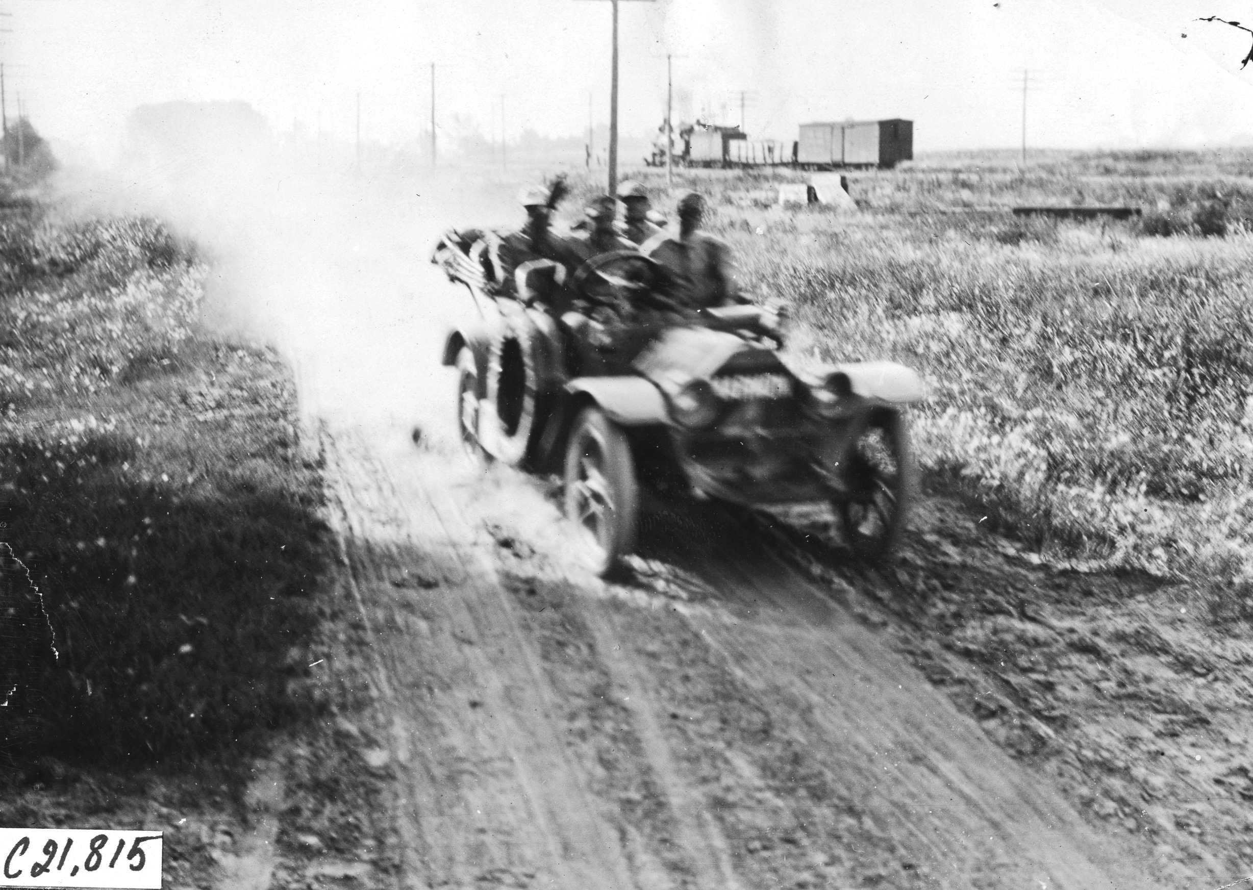 F. Wing in Marmon car on rural road near Missouri Valley, Iowa at 1909 Glidden Tour