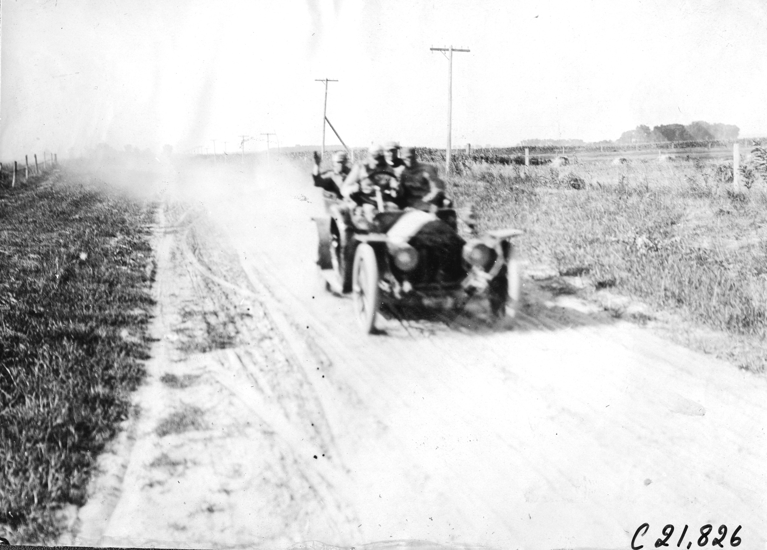 Duesenberg in Mason car on rural road near Missouri Valley, Iowa at 1909 Glidden Tour