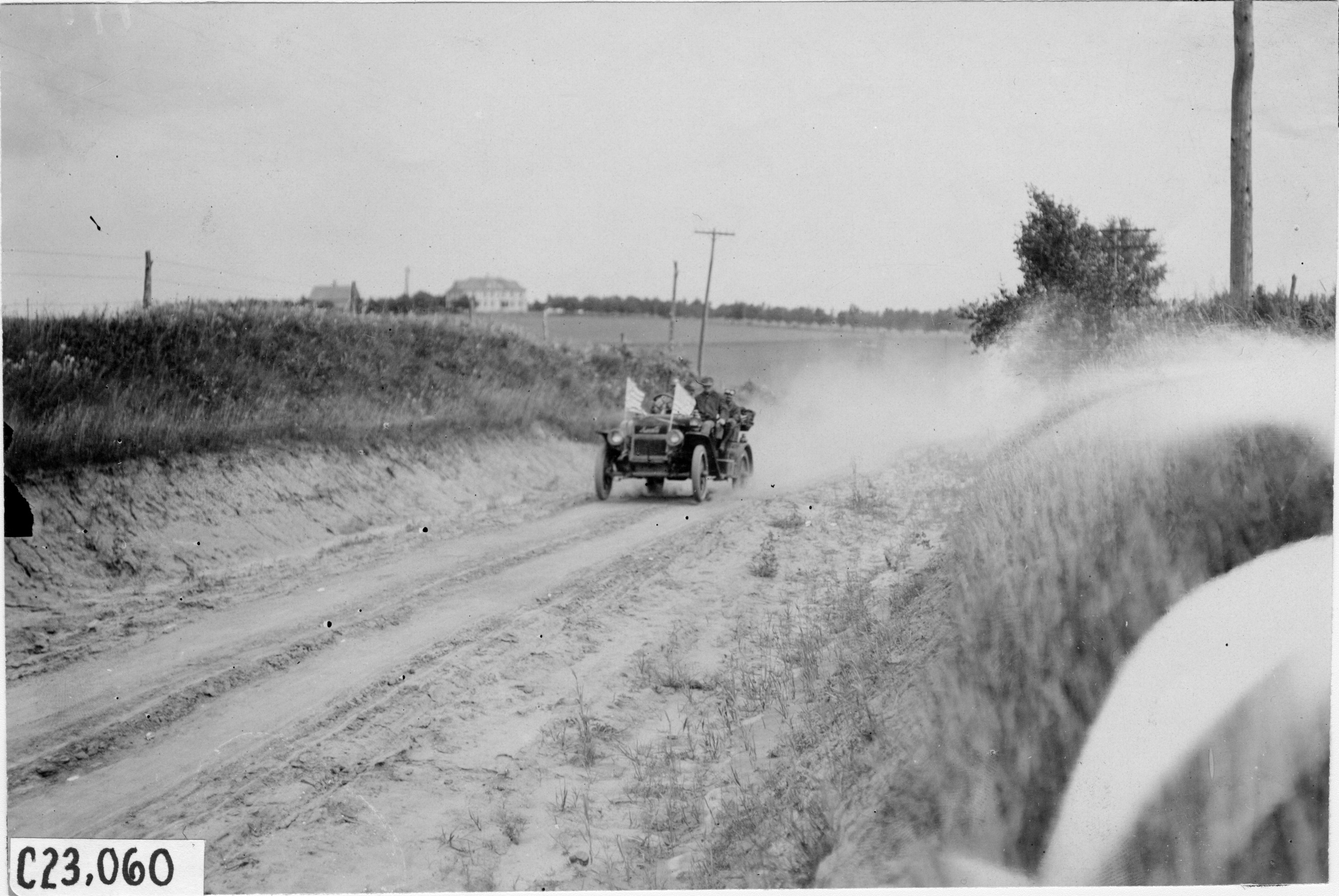 Maxwell car on rural road to Council Bluffs, Iowa at 1909 Glidden Tour