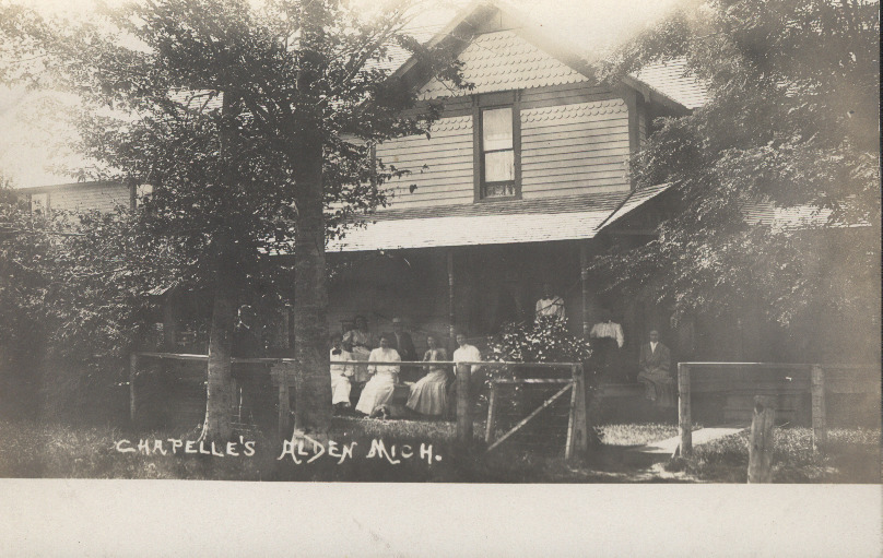 Black and white postcard of Chapelle's House, Alden, Michigan, with people on the porch ca. 1910