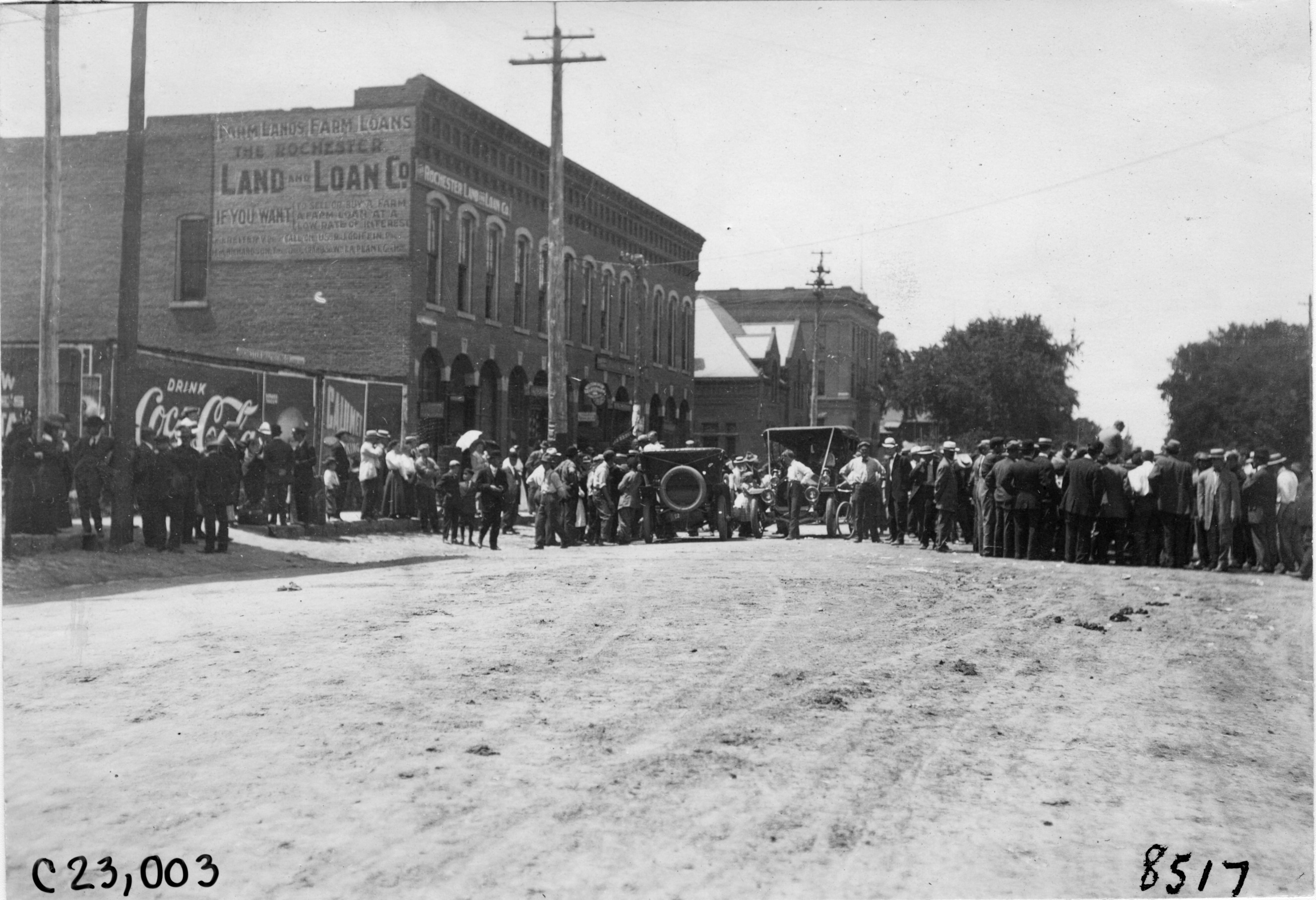 Crowd welcomes Glidden tourists to Council Bluffs, Iowa at 1909 Glidden Tour