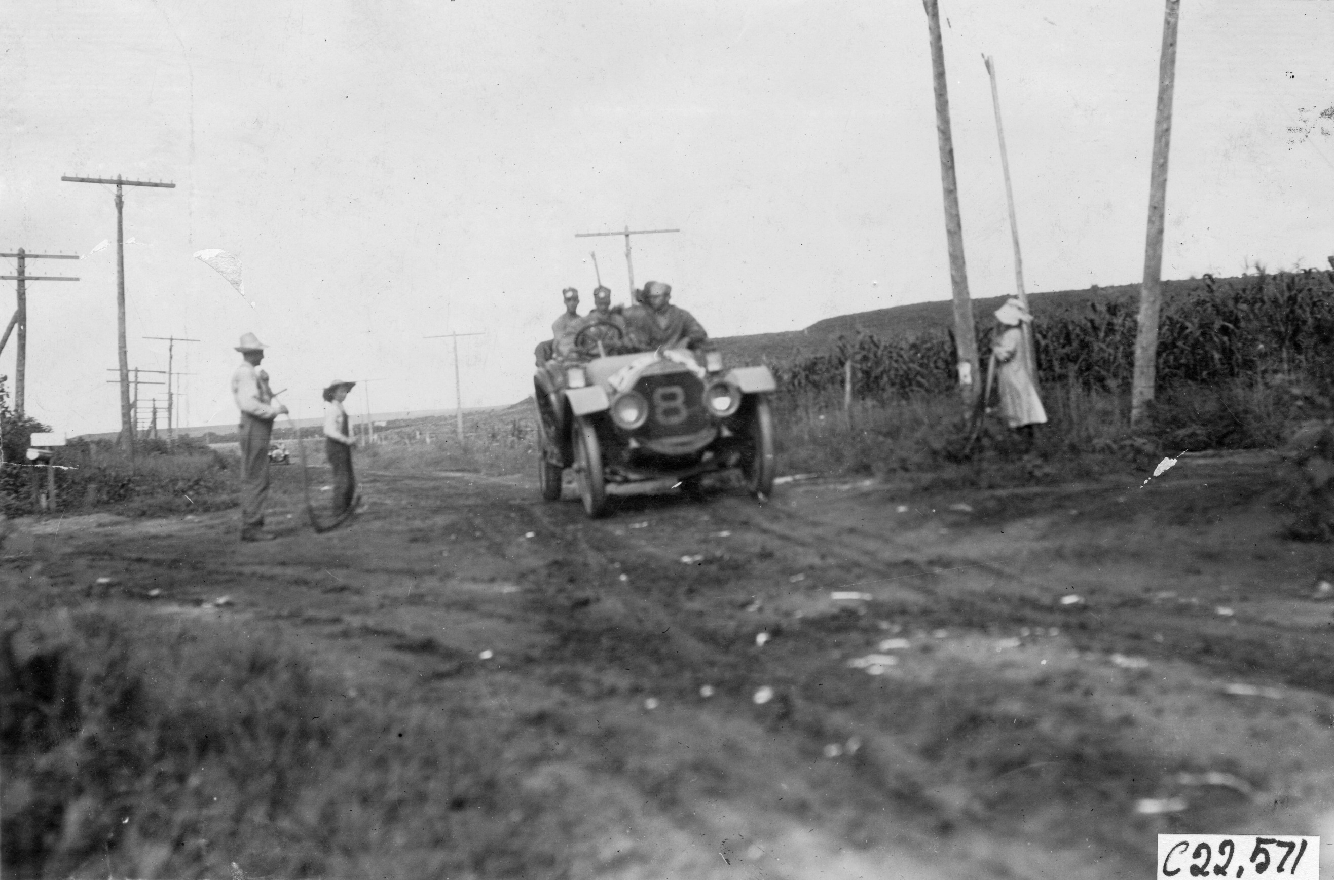 4.5x6.5 black and white photograph of Pierce-Arrow car #8, driver and three passengers on a dirt-paved road. Caption on photo back: 'Kelley Twins cheered the Pierce near Chapman,' at the 1909 Glidden Tour. Negative #C22,571.
