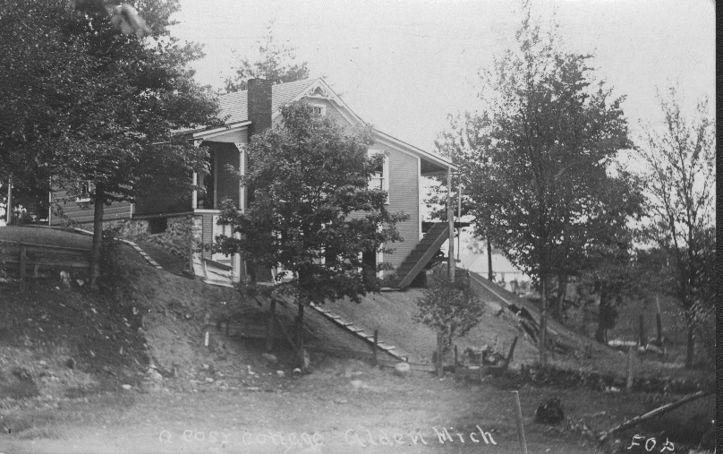 Black and white postcard of back of Edna Park Angell's Alden home, Alden, Michigan, before 1910, per back of card.
