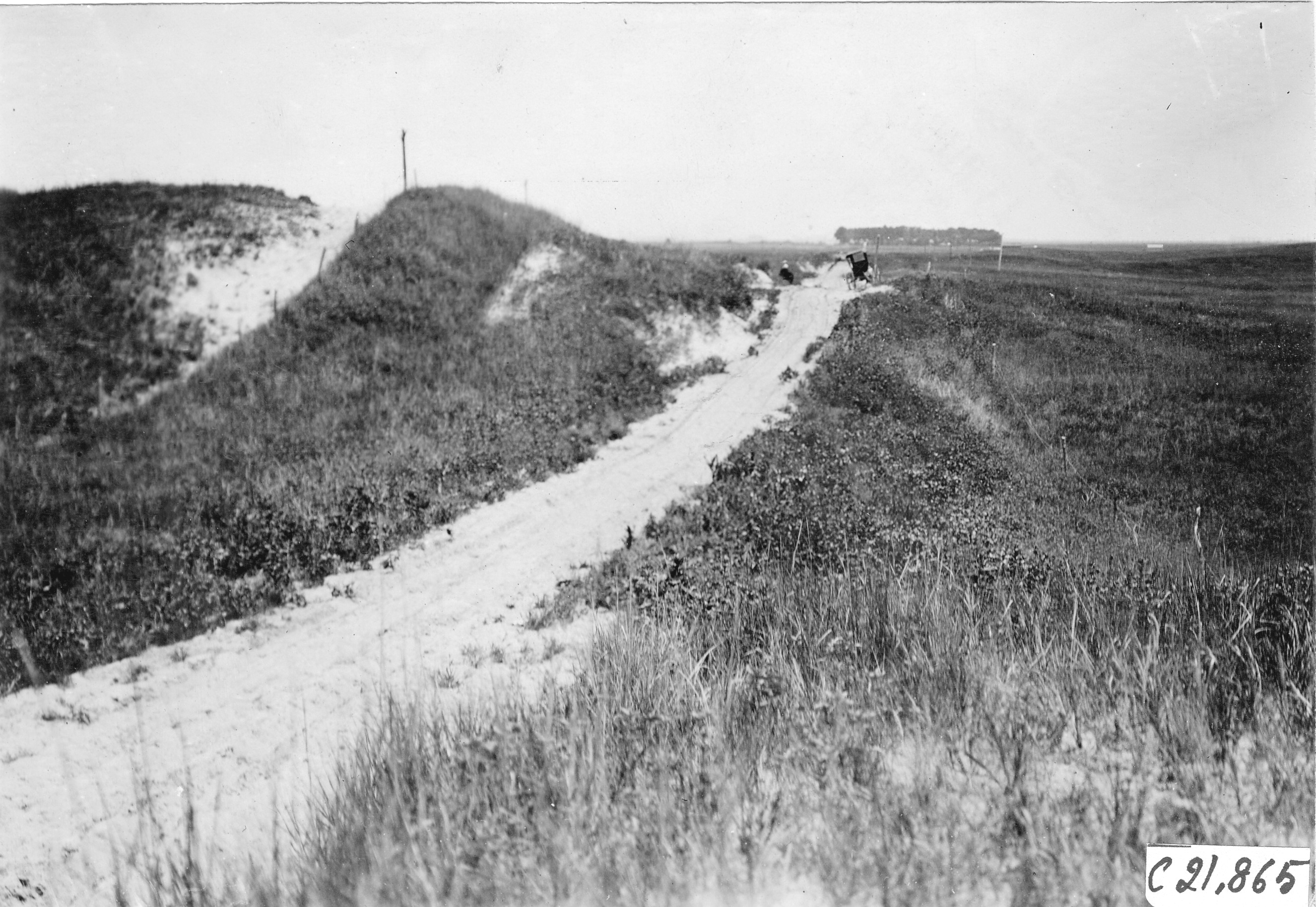 4.5x6.5 black and white photograph of a stretch of road in the sand hills. Caption on photo back: 'A worse stretch encountered near Sutherland in the sand hills (quicksand),' a carriage and man in the far background of photo in Nebraska, at the 1909 Glidden Tour. Negative #C21,865.