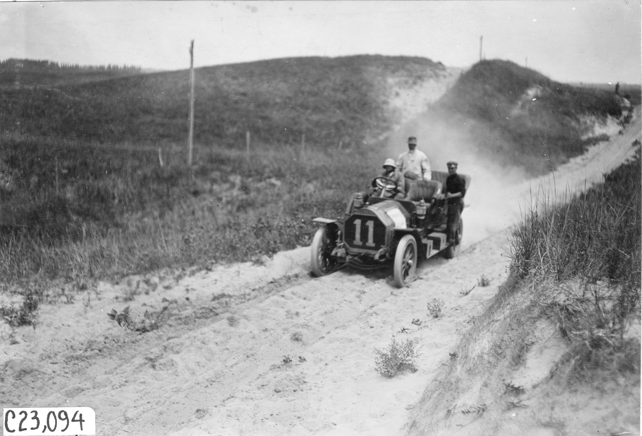 Thomas car coming out of sand near Sutherland, Neb., at the 1909 Glidden Tour