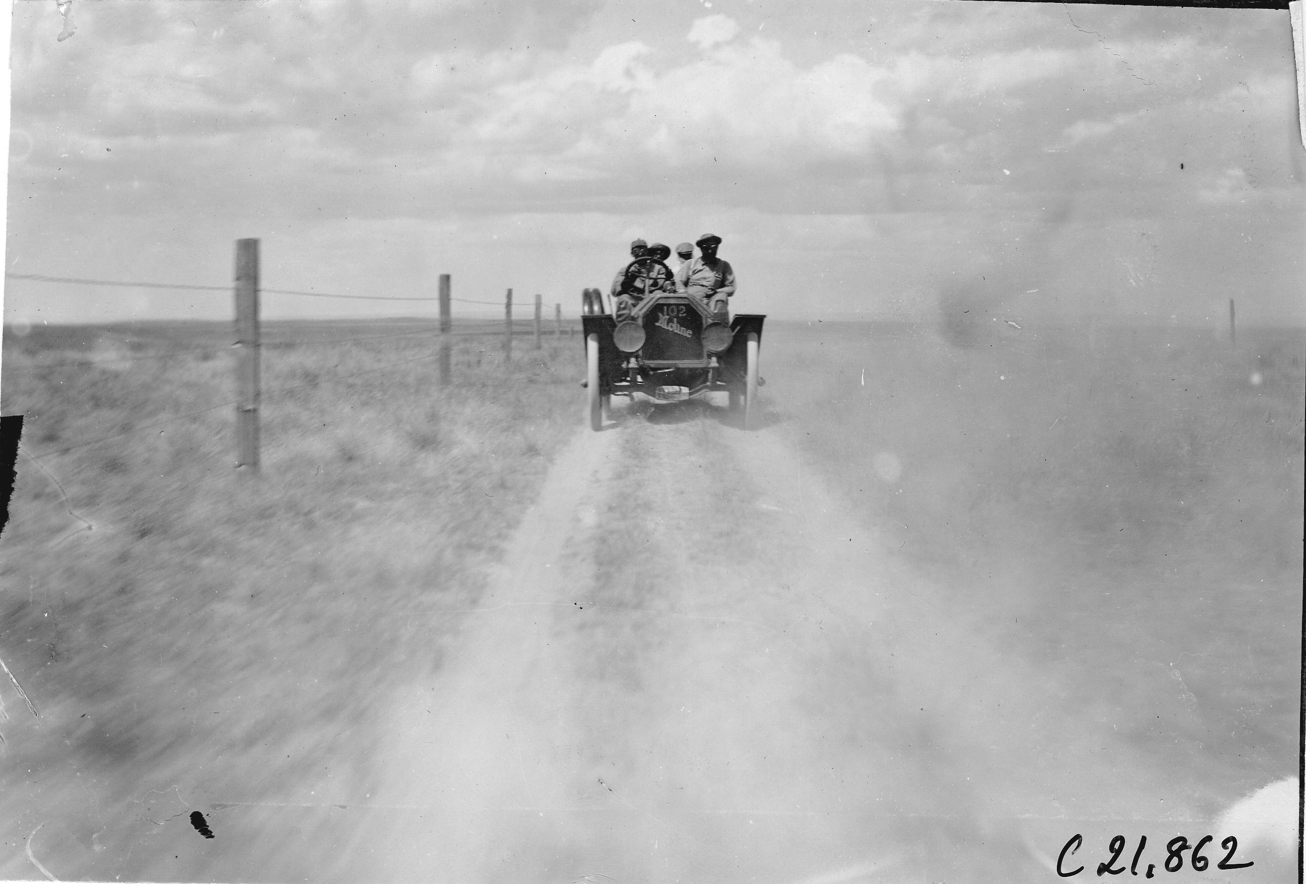 4.5x6.5 black and white photograph of Moline car #102 driver and three passengers driving through the prairie in Nebaska, at the 1909 Glidden Tour. Negative #C21,862.