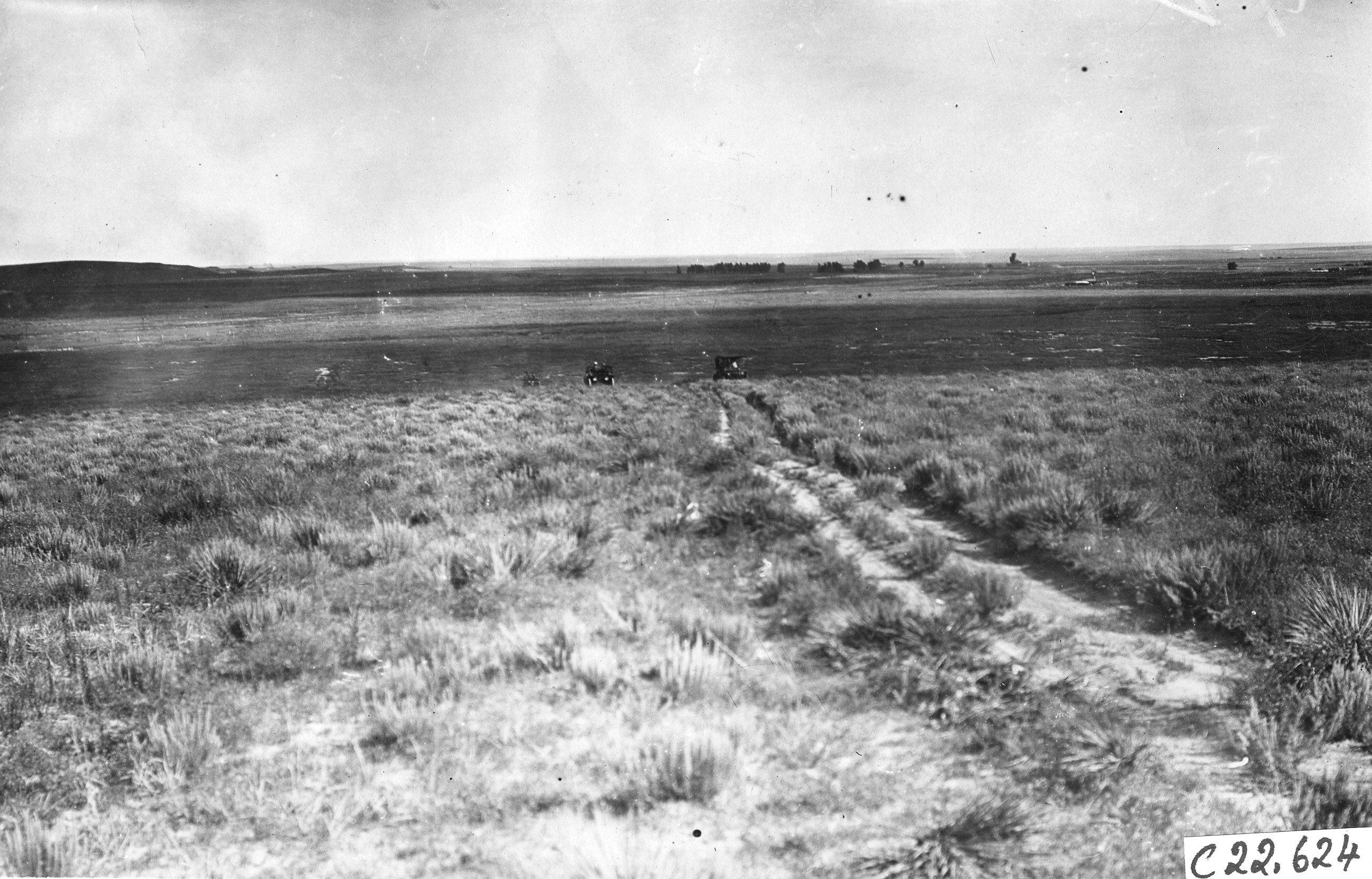 4.25x6.5 black and white photograph of Glidden cars from a distance on a two-track, dirt road on the prairie, at the 1909 Glidden Tour. Negative #C22,624.