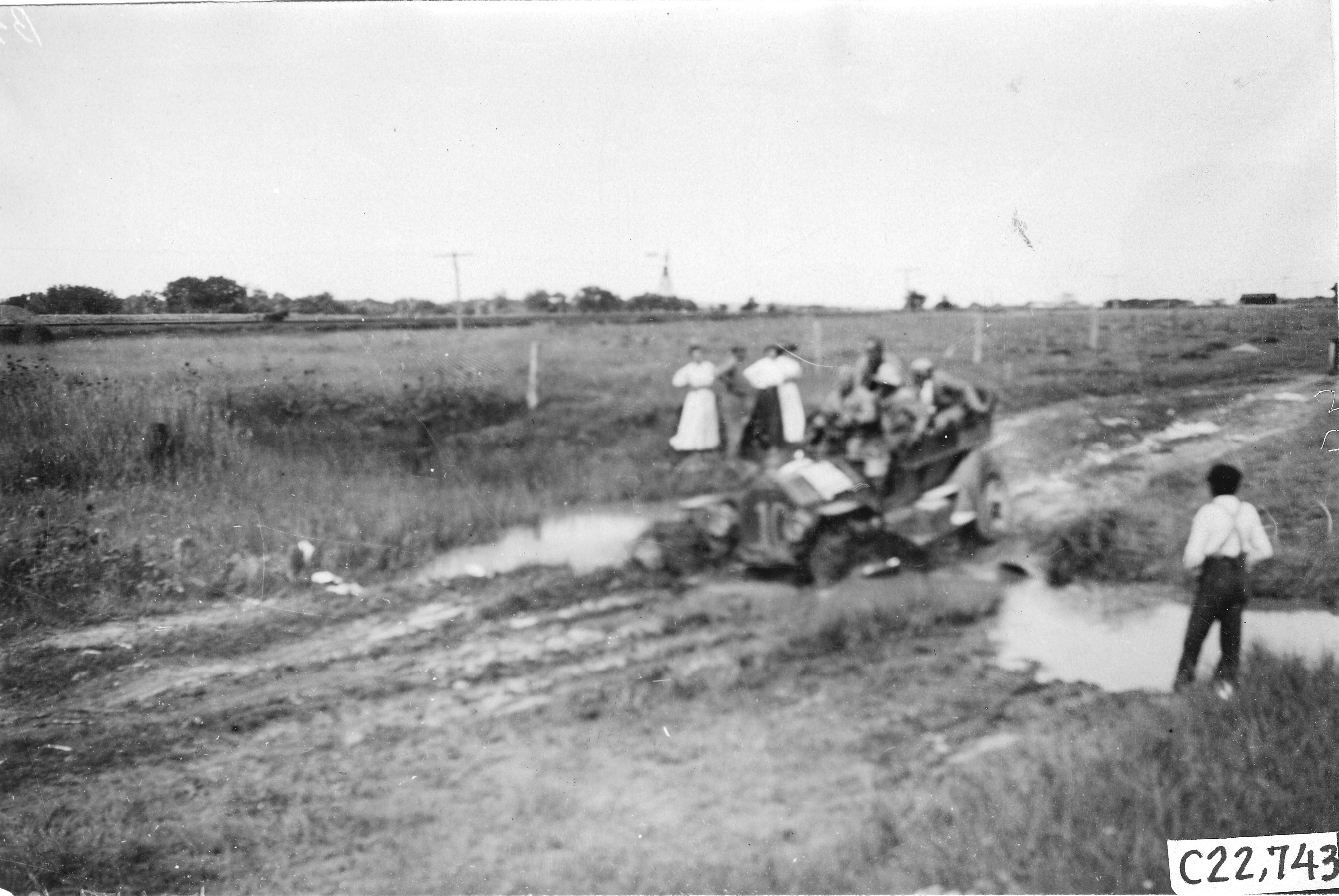 4.5x6.5 black and white photograph of tourist vehicle stuck in the mud on the Colorado prairie, at the 1909 Glidden Tour. Negative #C22,743. Image is blurry.