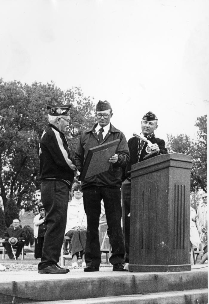 Memorial Dedication Bill Jens stands left, Bob Sutton stands center, Bill Wright stands right. 8 1/2x11 black and white print.