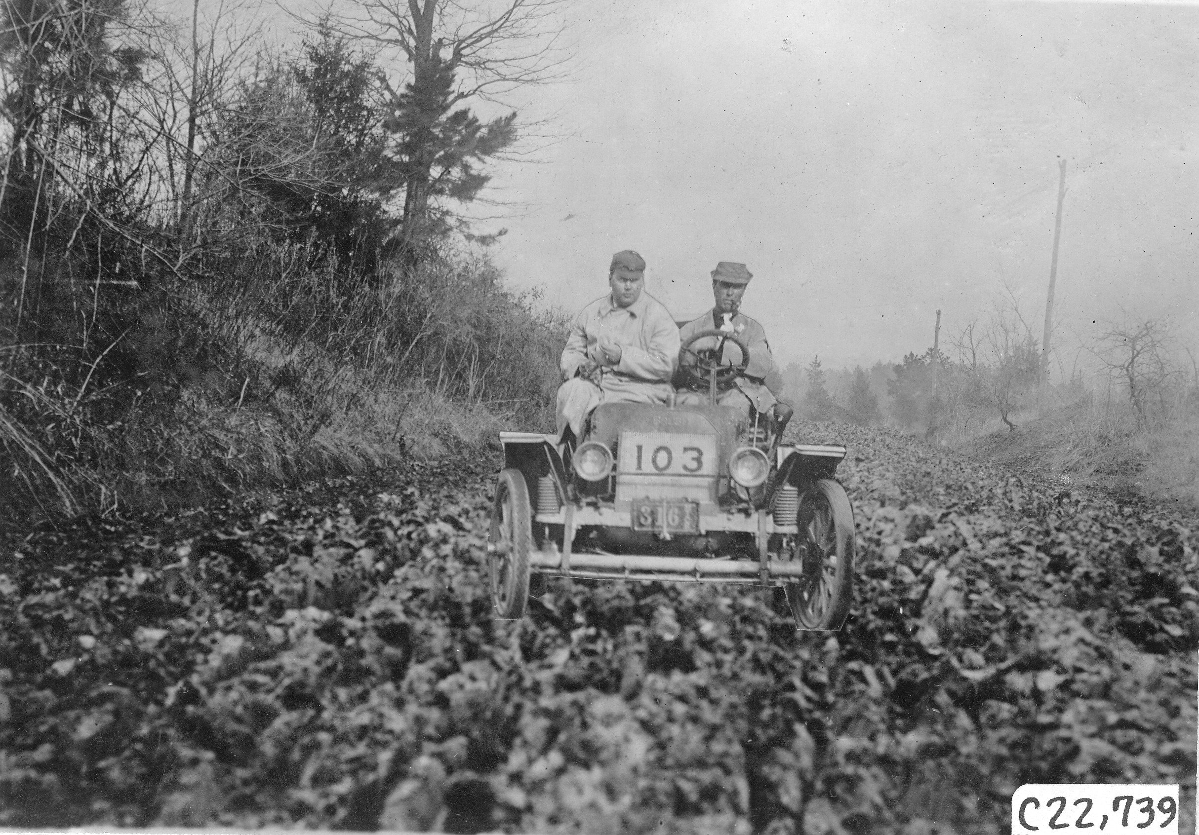 4.25x6.25 black and white photograph of tourist vehicle #103 with driver and passenger on muddy road in Colorado, at the 1909 Glidden Tour. Negative #C22,739. Photo of vehicle appears to be superimposed on photo of road.