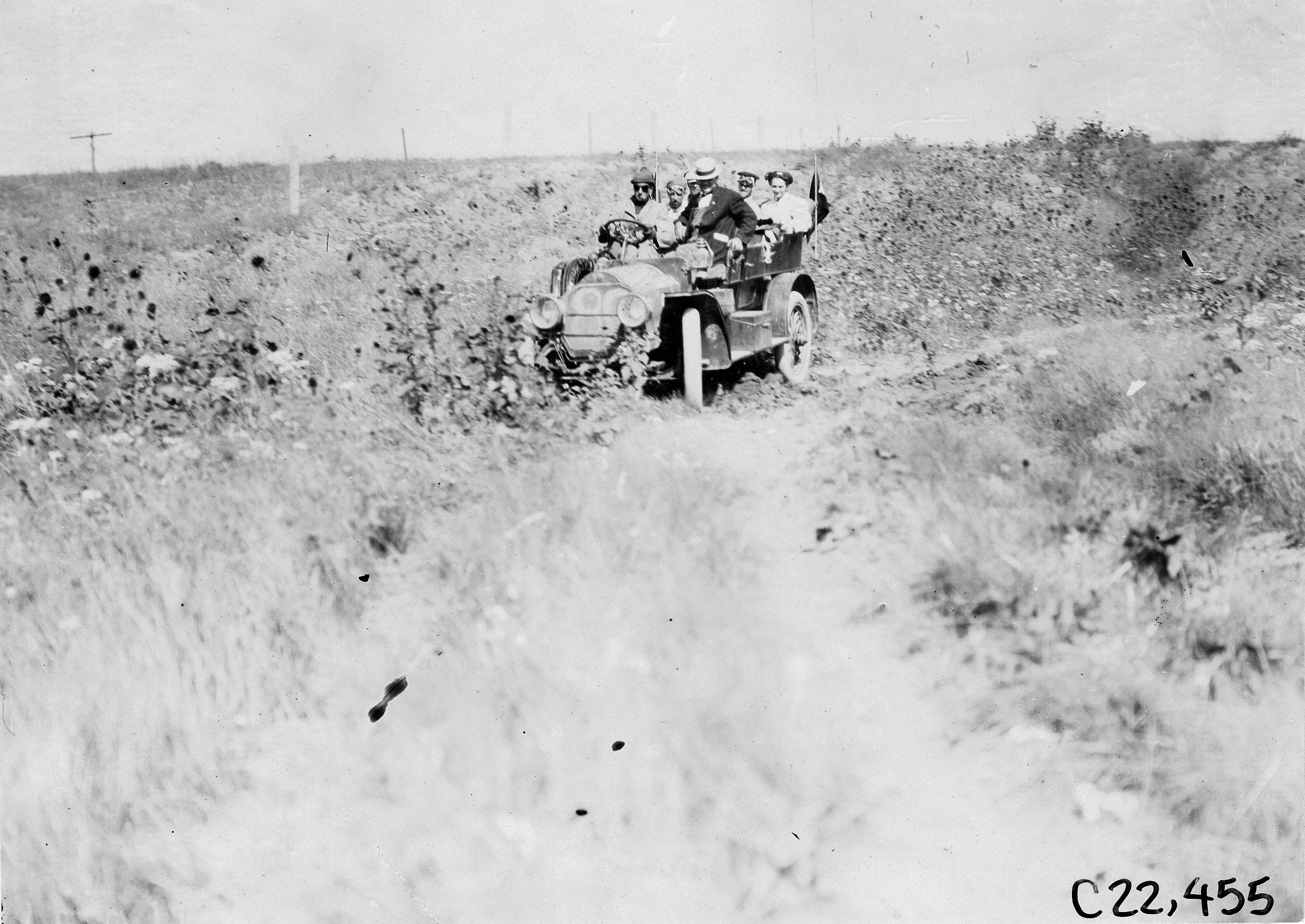 4.5x6.25 black and white photograph of tourist vehicle on rural road near Aurora, Colorado, at the 1909 Glidden Tour. Negative #C22,455.