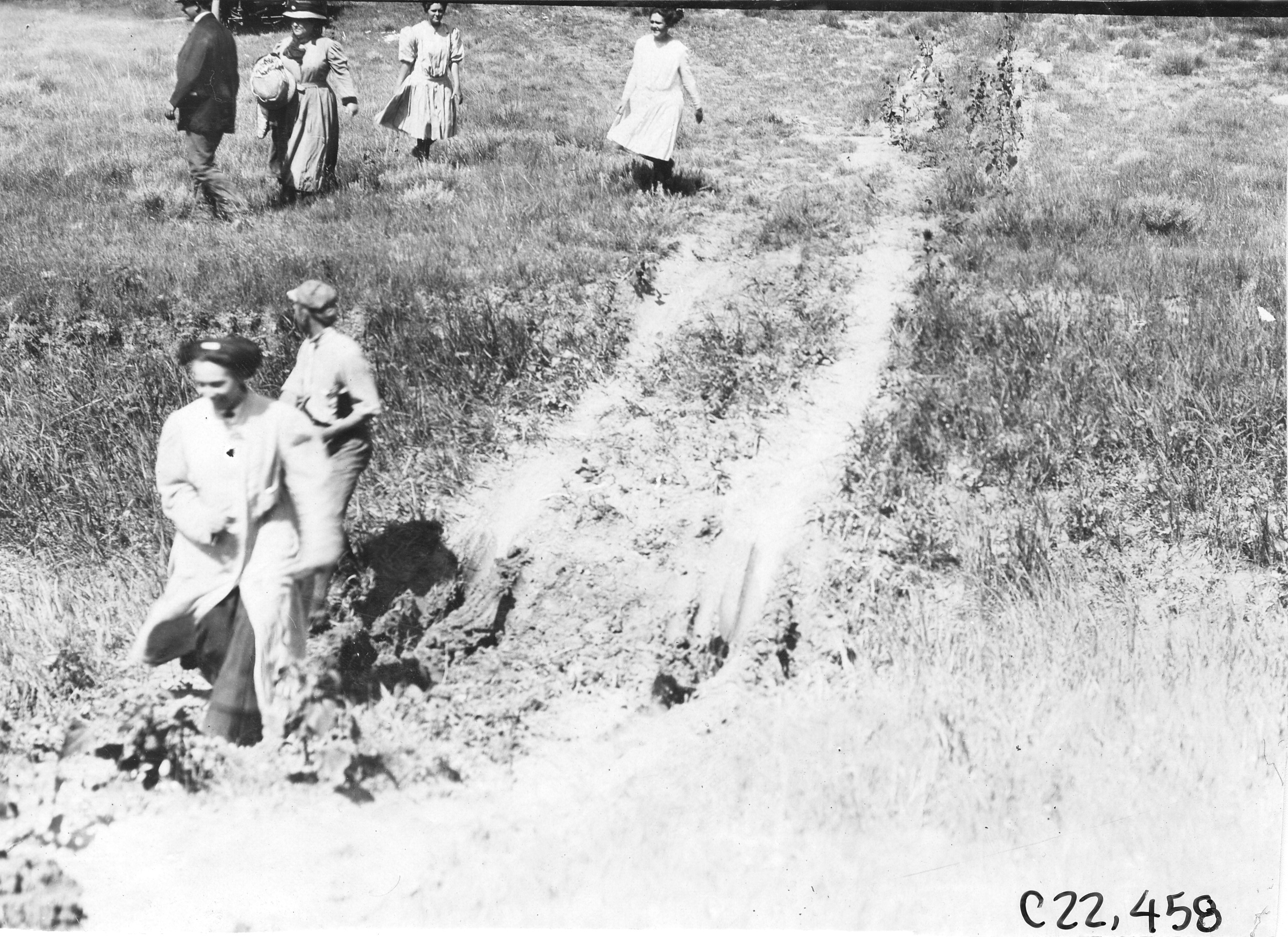 4.75x6.75 black and white photograph of a woman walking through a large hole on a rural road near Aurora, Colorado, other women gather in background, at the 1909 Glidden Tour. Negative #C22,458.
