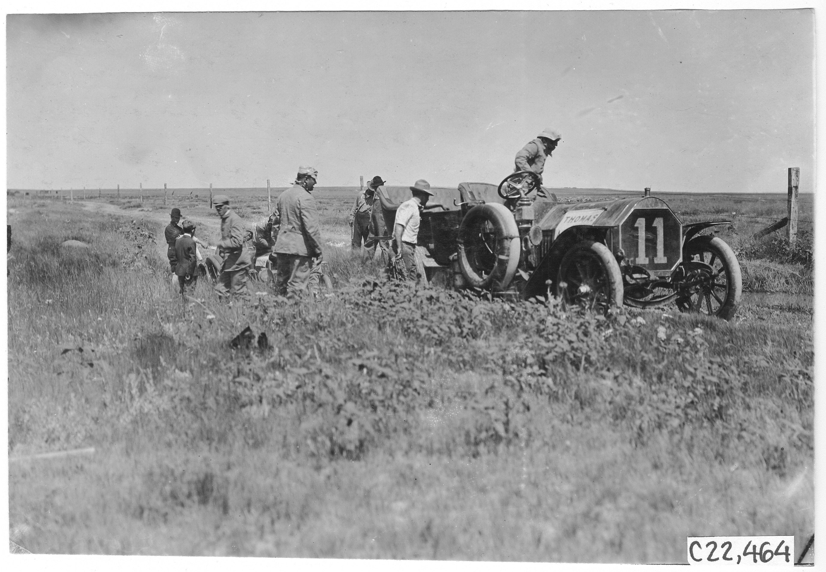 4.5x6.75 black and white photograph of Thomas #11 crossing a large ditch, near Aurora, Colorado, at the 1909 Glidden Tour. Negative #C22,464. Photo edges cut unevenly.