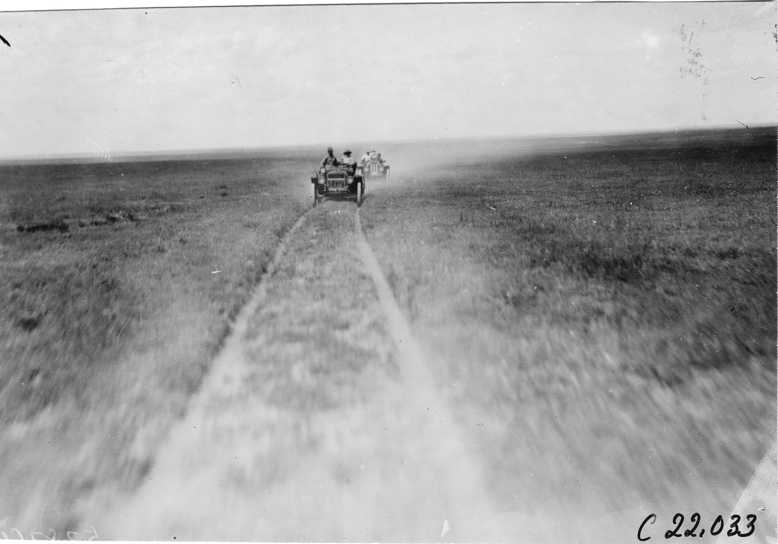 4.5x6.5 black and white photograph of participants on a two-track road. Caption on photo back: 'Maxwell car #107 leading Jewel …across prairie, 60 miles from Denver.' At the 1909 Glidden Tour. Negative #C22,033. Photo edges cut unevenly.
