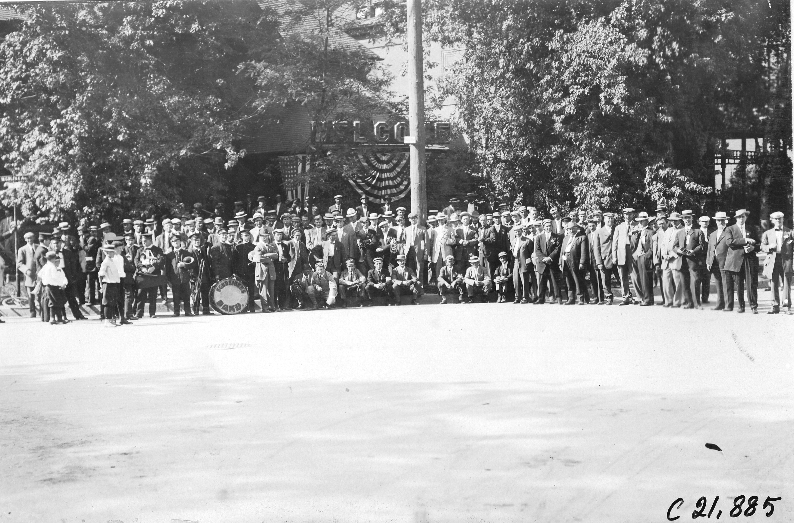4.5x6.5 black and white photograph of Glidden tourists and Schreiber's Band posed in front of the Denver Motor Club, Denver, Colorado, at the 1909 Glidden Tour. Negative #C21,885.