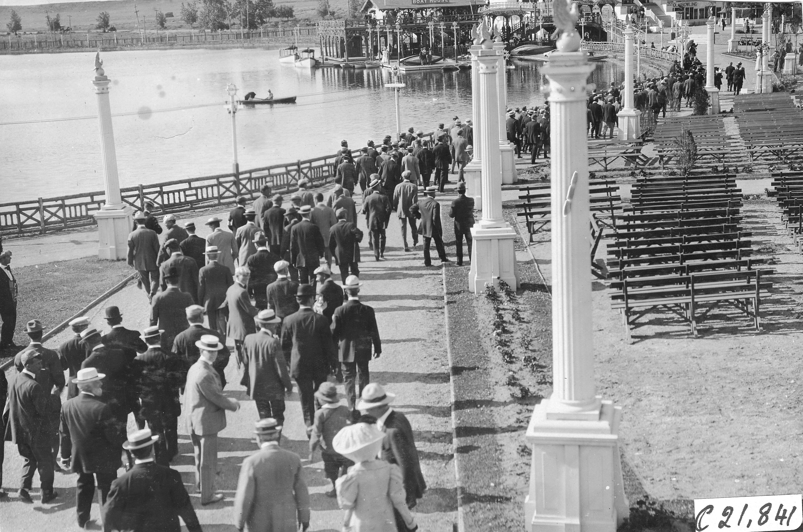 4.5x6.75 black and white photograph of large group of tourists and onlookers walking along lake at Lakeside Park, Denver, Colorado, at the 1909 Glidden Tour. Caption on photo back: 'Tourists enjoying the sights at Lakeside Park, entertained by Denver Motor Club.' Negative #C21,841.