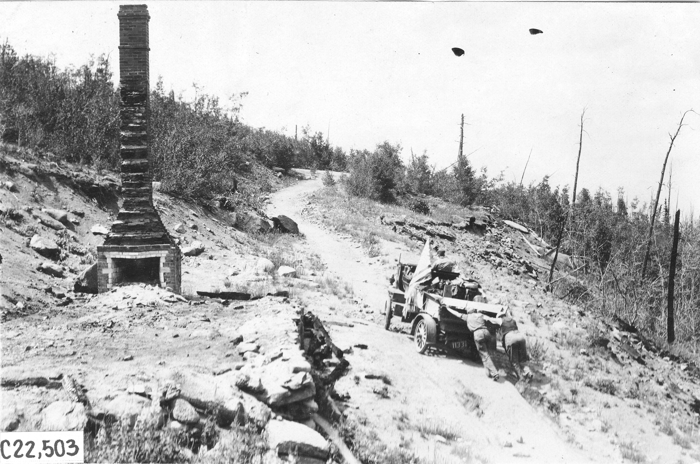 4.5x6.75 black and white photograph of two tourists pushing Rapid motor truck up a steep mountain road, past a free standing fireplace in Colorado, at the 1909 Glidden Tour. Negative #C22,503.