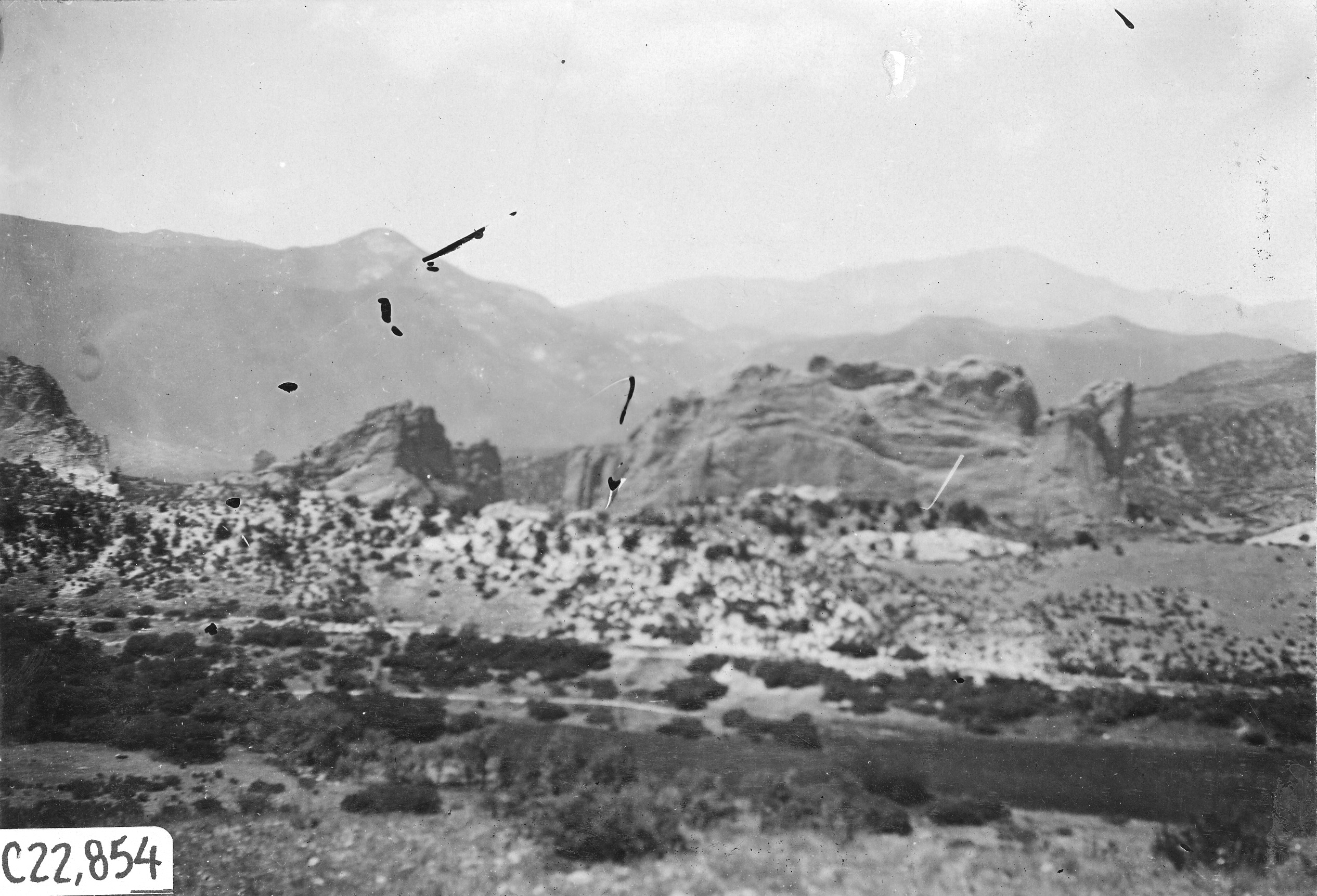 4.25x6.25 black and white photograph of mountain view in Colorado, at the 1909 Glidden Tour. Negative #C22,854.
