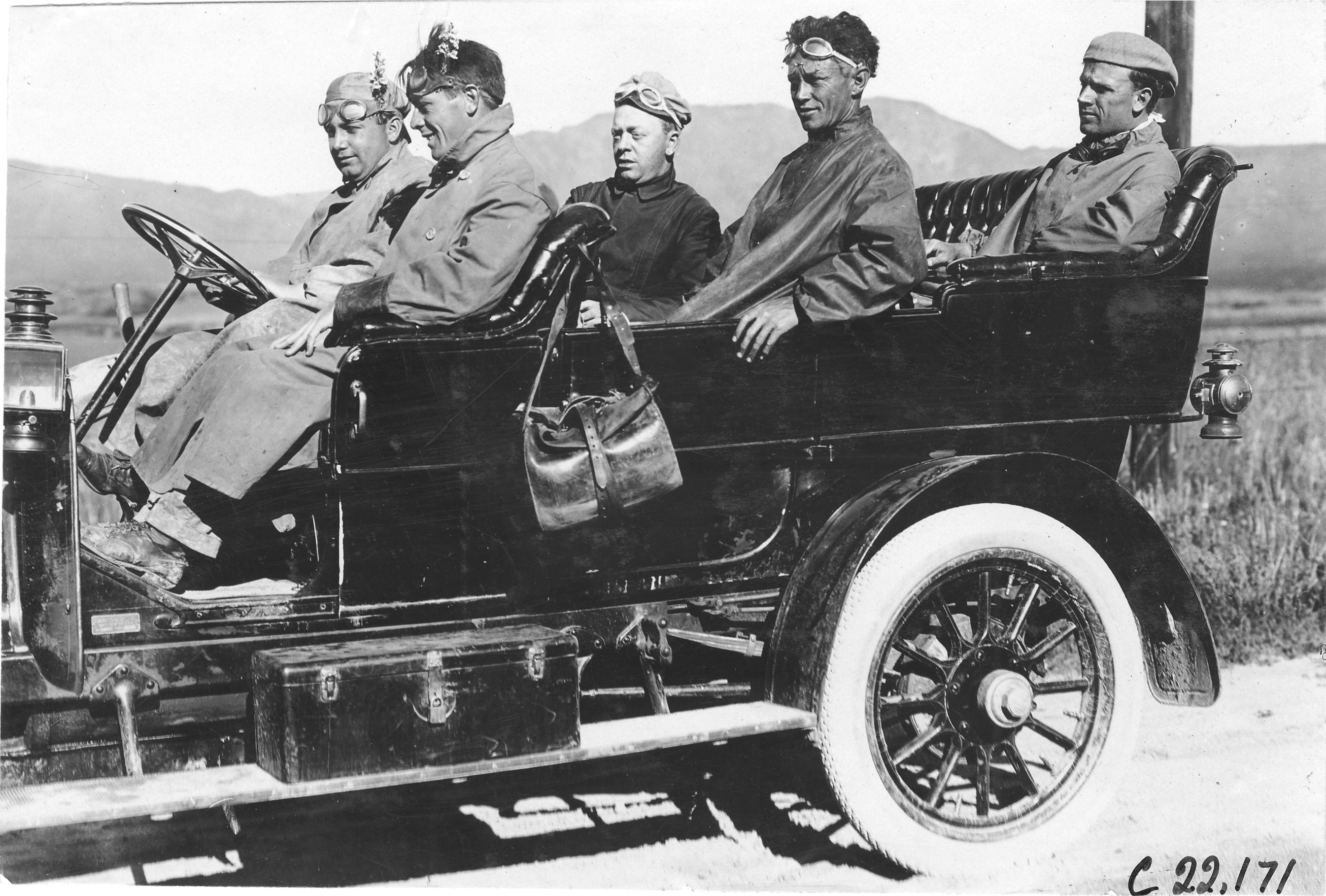 Harry McIntosh and crew pose in Studebaker press car on rural road in Colo., at 1909 Glidden Tour