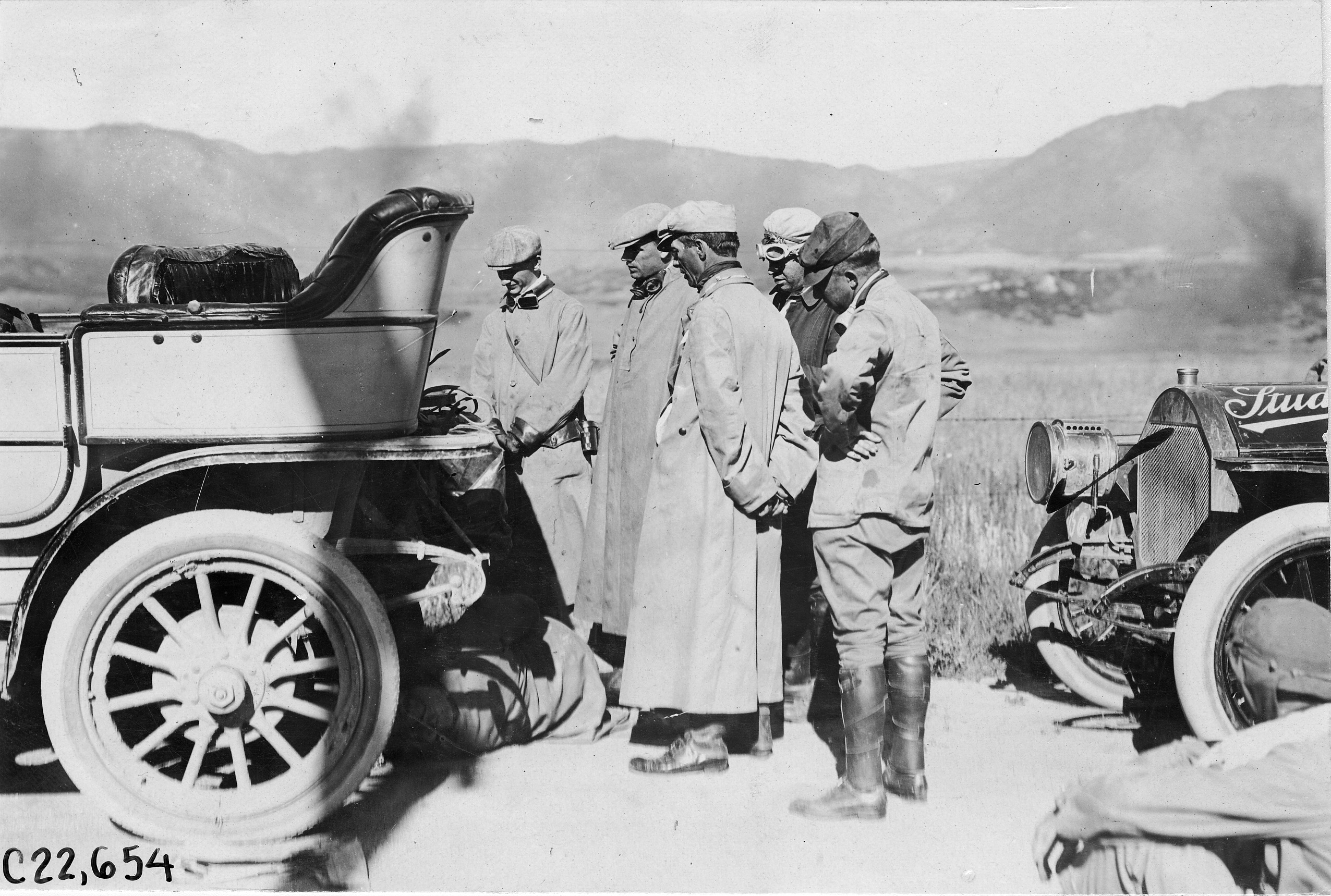 Glidden tourists watch man work on car near Colorado Springs, Colo., at 1909 Glidden Tour