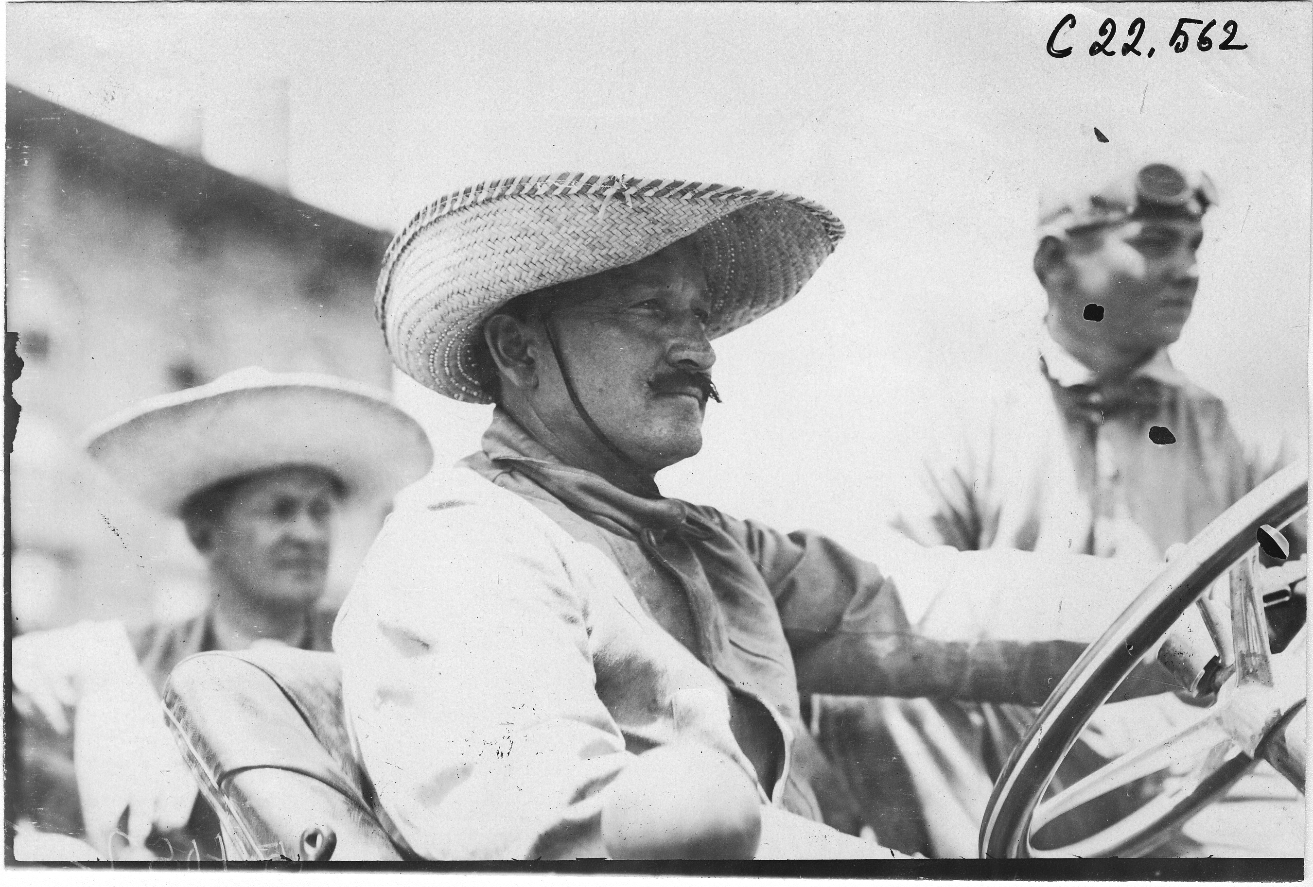 4.5x6.75 black and white photograph of Frank Wing and two passengers in Marmon car #4 wearing straw sun hats, passenger in front seat is wearing a hat with goggles, in Colorado Springs, Colorado, at the 1909 Glidden Tour. Negative #C22,562.