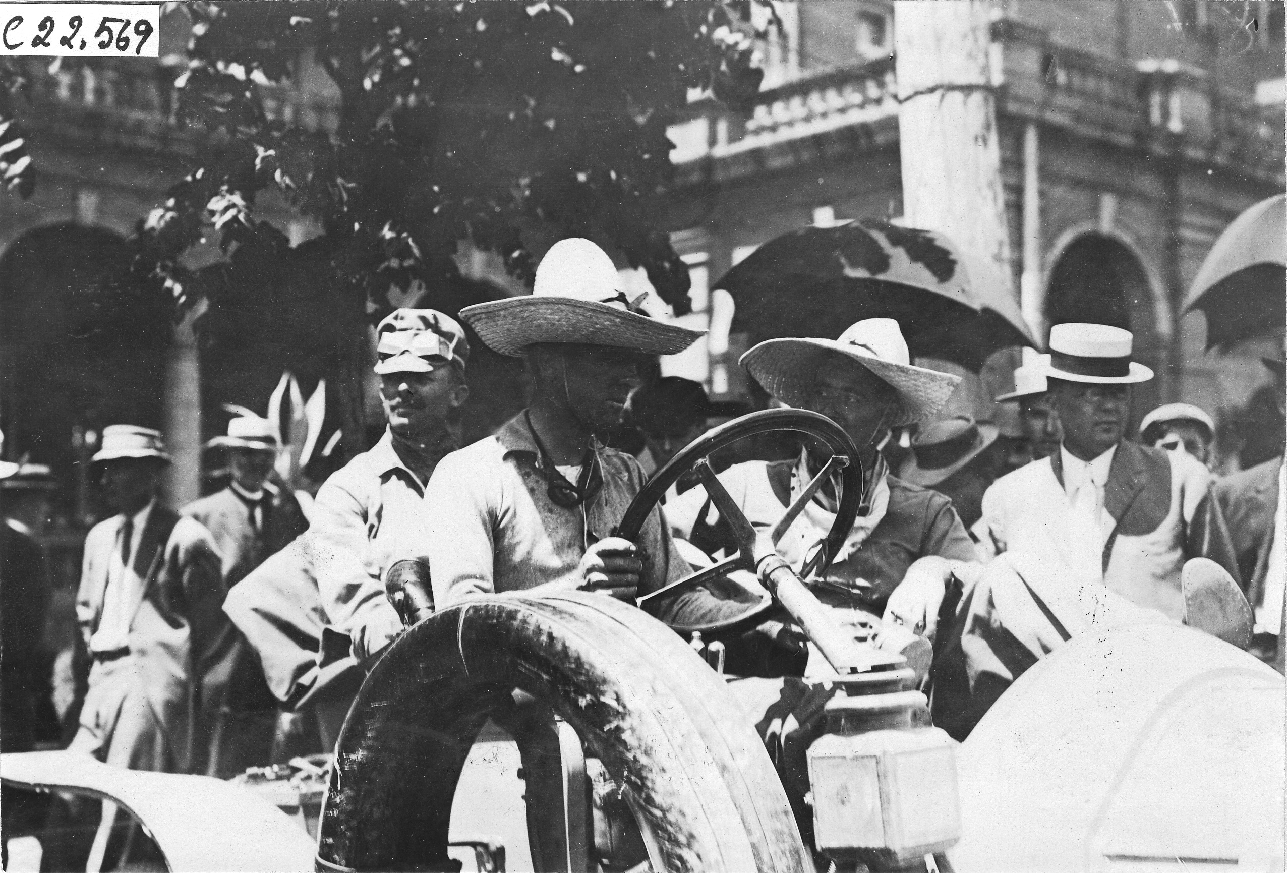 4.25x6.5 black and white photograph of Al Keller and two passengers wearing hats, the men in the front of car are wearing sun hats, a crowd of spectators are looking on, in front of the Antlers Hotel in Colorado Springs, Colorado, at the 1909 Glidden Tour. Negative #C22,569.