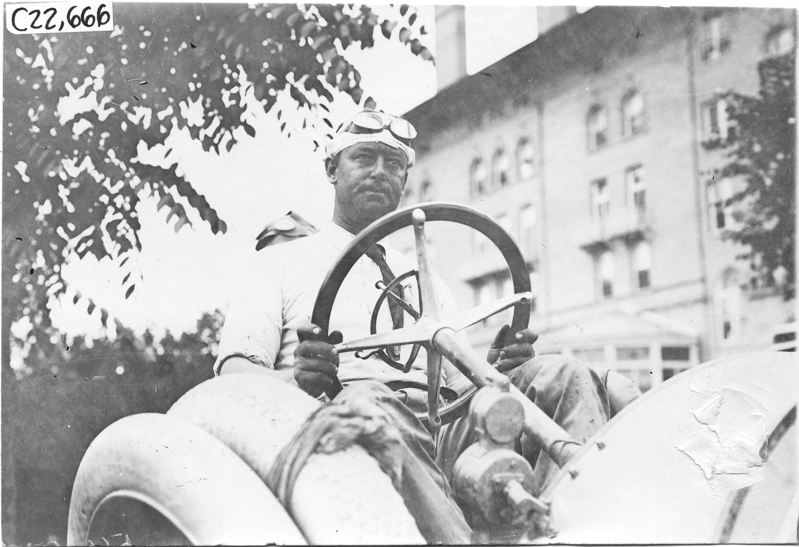 4.5x6.5 black and white photograph of driver, hands on steering wheel, wearing hat and goggles and looking straight ahead, in front of the Antlers Hotel in Colorado Springs, Colorado, at the 1909 Glidden Tour. Negative #C22,666.Photo edges cut unevenly.
