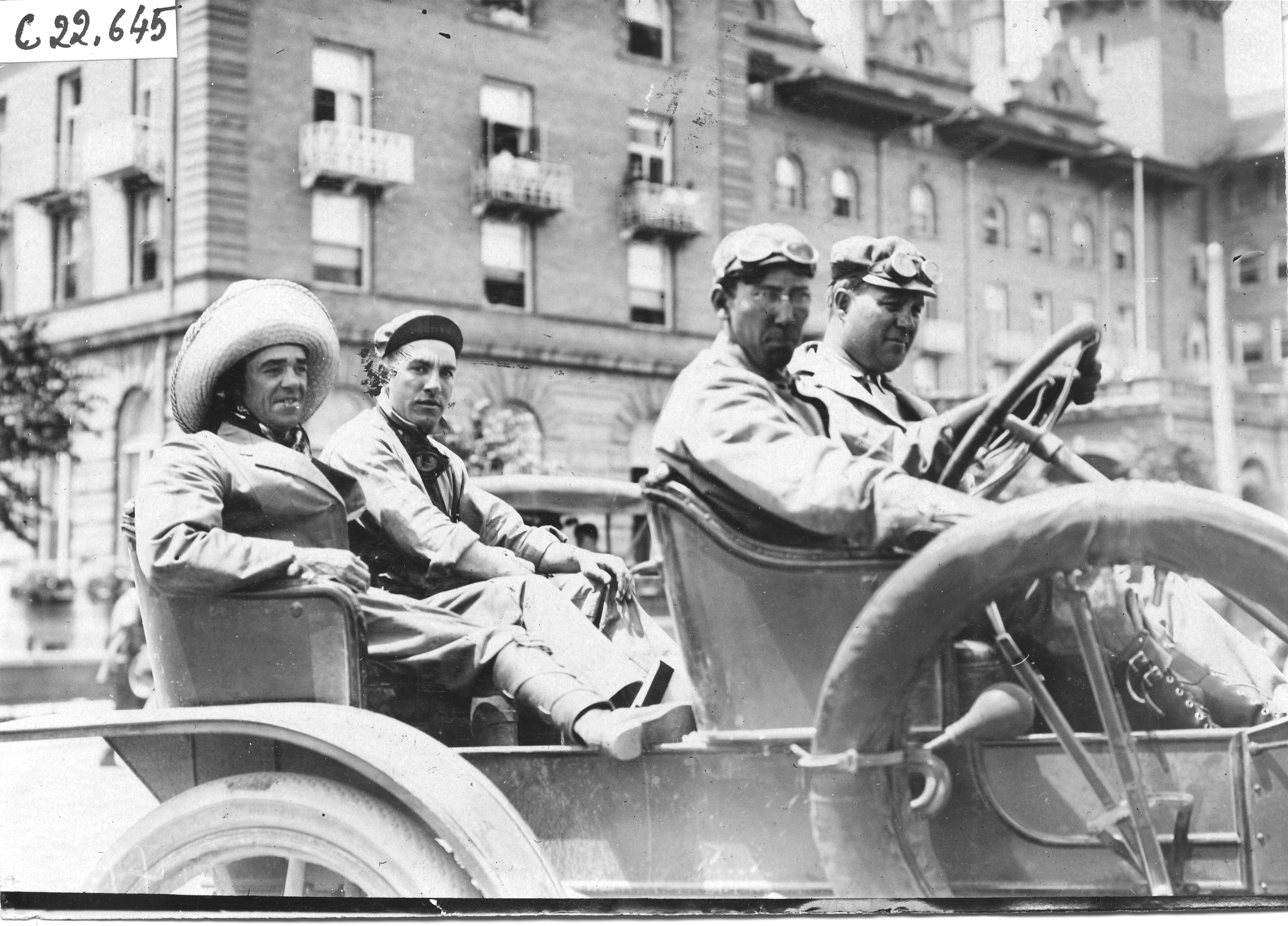 4.5x6.25 black and white photograph of driver and three passengers, man in rear seat wearing a sun hat, in front of the Antlers Hotel in Colorado Springs, Colorado, at the 1909 Glidden Tour. Negative #C22,645. Photo edges cut unevenly.